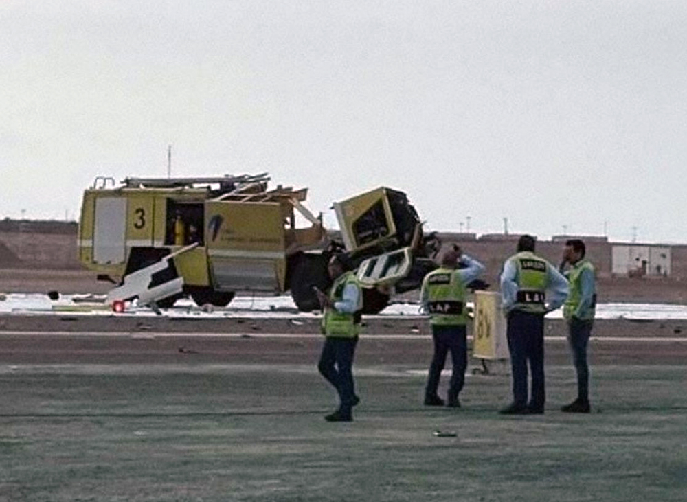 The airplane was on a schedule service (flight LA2213) from Lima to Juliaca. On board were 102 passengers and a crew of six. During the takeoff roll on runway 16L, after a course of 1,200 metres and at a speed of 131 knots, the aircraft collided with a fire truck that entered the active runway from the right, at taxiway Bravo. A team of two heavy fire trucks and one light support vehicle were engaged in a 'Response Time' exercise that started at 1510LT, one minute prior to the accident. The goal of this exercise was to test the capacity of the new fire station. The first fire truck entered the active runway while the airplane was accelerating for takeoff. Upon impact, the right main gear and the right engine were torn off. The airplane caught fire and slid for about 1,600 metres then veered to the right and came to rest, bursting into flames. Forty passengers were injured, among them four seriously. The airplane was heavily damaged by fire and written off. Among the personnel in the fire truck, two were killed and a third was seriously injured.