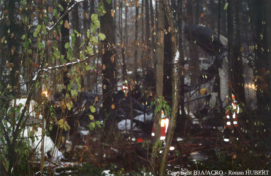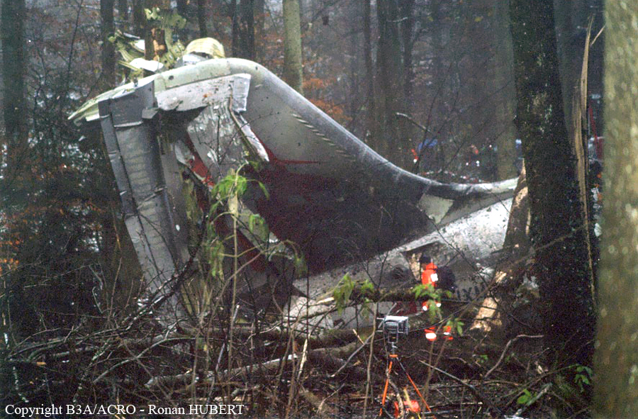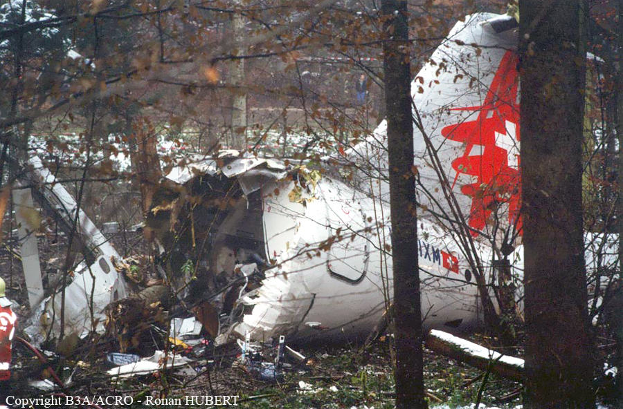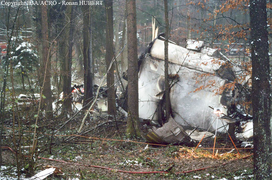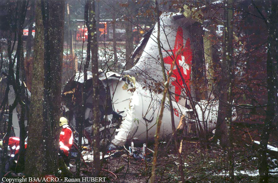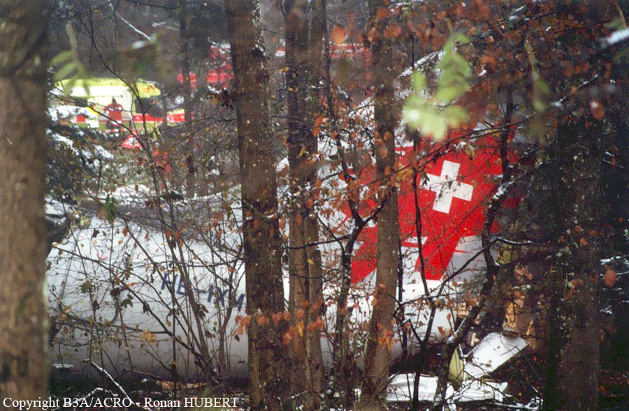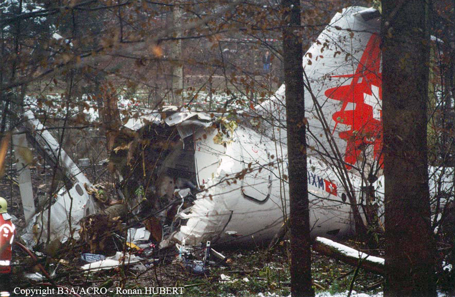 On 24 November 2001 at 20:01 UTC the aircraft AVRO 146 RJ 100, registered as HB-IXM of the Crossair airline company took off in darkness from runway 26L at Berlin-Tegel airport as scheduled flight CRX3597 to Zurich. At 20:58:50 UTC, after an uneventful flight, the aircraft received the clearance for a standard VOR/DME approach 28 at Zurich airport.Ahead of the aircraft involved in the accident, an Embraer EMB 145, flight CRX3891, landed on runway 28 at Zurich airport. The crew informed the control tower that the weather was close to the minimum for this runway. At 21:05:21 UTC flight CRX3597 reported on the aerodrome control frequency. When the aircraft reached the minimum descent altitude (MDA) of 2,390 feet QNH at 21:06:10, the commander mentioned to the copilot that he had certain visual ground contact and continued the descent. At 21:06:36 UTC the aircraft collided with treetops and subsequently crashed into the ground. The aircraft caught fire on impact. Twenty-one passengers and three crew members died from their injuries at the site of the accident; seven passengers and two crew members survived the accident. The wreckage was found in the Geissbühl forest, 4,050 metres short of runway 28.