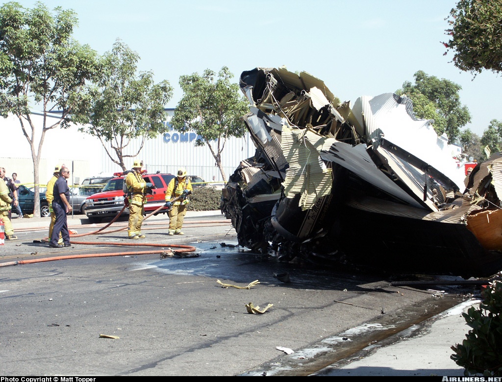 The airplane crashed onto a street adjacent to the airport shortly after takeoff. As the airplane started its takeoff roll, it began to veer to the left off of the runway. About midway down the runway the airplane lifted off the ground and flew over a crowd of people assembled at the airport for an airport appreciation day. The airplane climbed to about 50 feet, made a steep roll to the left, flying in-between the control tower and a light pole, and crossed over the boundary fence where the left wing struck a moving vehicle before coming to rest against several parked cars. Numerous photographs (including video footage) were taken by witnesses on the airport of the airplane on the takeoff ground roll and throughout the accident sequence. The photographs clearly show a nylon strap connecting the left elevator and rudder. It was surmised that the use of the nylon strap was as a flight control/gust lock for the airplane. During the investigation, a nylon strap was observed hanging from an S-hook that was attached to the vertical stabilizer/rudder hinge attach point. The loop at the other end of the strap had come apart, and when investigators looked under the left stabilizer/elevator hinge attach area they noted a similar S-hook attached to the hinge attach area.