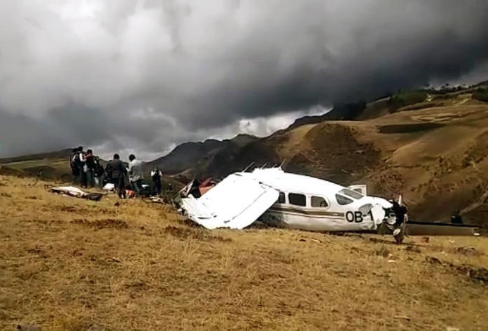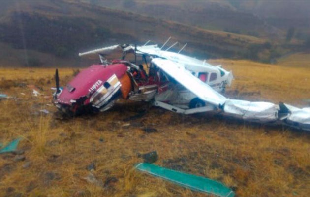 The single engine aircraft was completing a charter flight from Trujillo to Pucallpa, carrying two pilots and pilot. While cruising over the Cajamarca Province, the pilot encountered poor weather conditions with heavy rain falls. He modified his route and was able to continue under VFR mode in good weather conditions. Nevertheless, he continued at an insufficient altitude when the aircraft impacted ground and crashed in a mountainous area. The aircraft was destroyed by impact forces and all three occupants were killed. There was no fire.