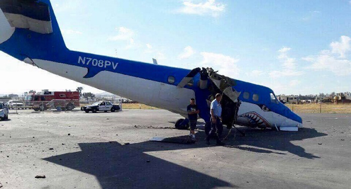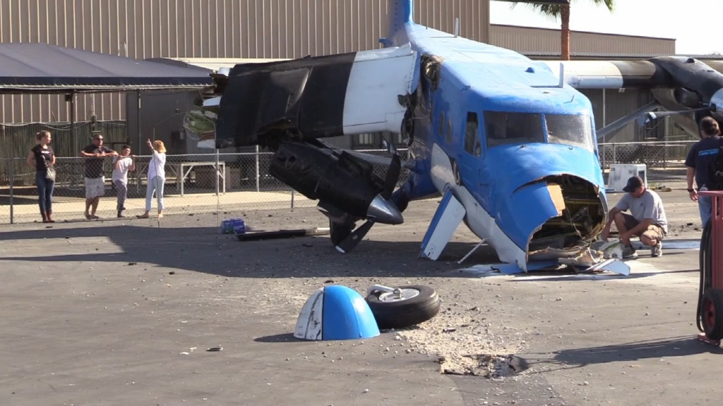The pilot of the twin-engine, turbine-powered airplane reported that, while providing flights for skydivers throughout the day, he had a potential new hire pilot flying with him in the right seat. He added that, on the eighth flight of the day, the new pilot was flying during the approach and "approximately 200 feet south from the threshold of [runway] 15 at approximately 15 feet AGL [above ground level] the bottom violently and unexpectedly dropped out. [He] believe[d] some kind of wind shear caused the aircraft [to] slam onto [the] runway and bounce into the air at a 45 to 60-degree bank angle to the right." The prospective pilot then said, "you got it." The pilot took control of the airplane and initiated a go-around by increasing power, which aggravated the "off runway heading." The right wing contacted the ground, the airplane exited the runway to the right and impacted a fuel truck, and the right wing separated from the airplane. The impact caused the pilot to unintentionally add max power, and the airplane, with only the left engine functioning, ground looped to the right, coming to rest nose down.