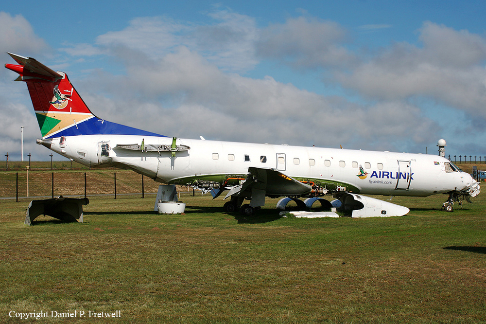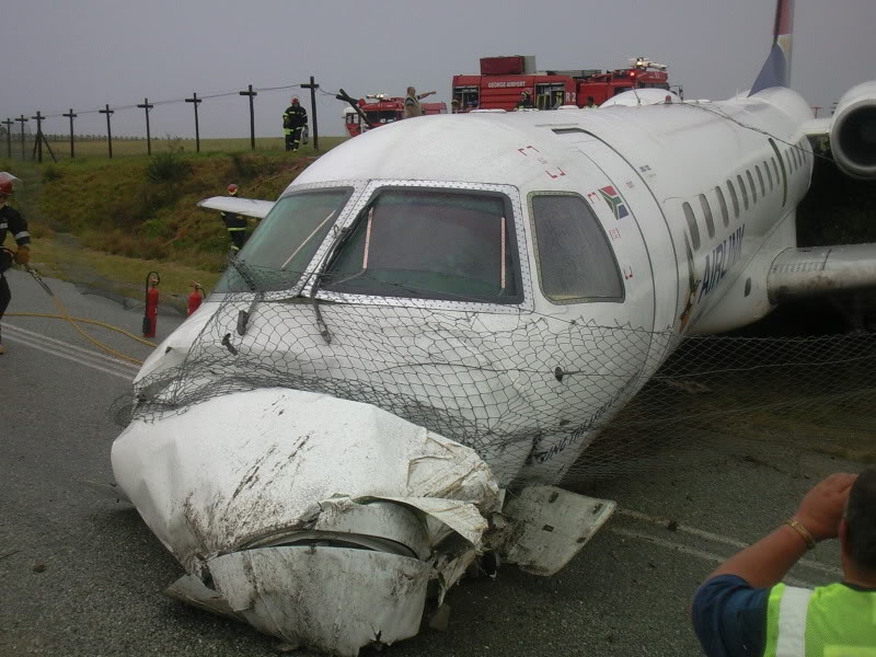 Flight SA8625 departed from Cape Town International Airport on a domestic scheduled flight to George Airport (FAGG) with three crew members and 32 passengers on board. The weather at FAGG was overcast with light rain, and the aircraft was cleared for an instrument landing system approach for runway 11. It touched down between the third and fourth landing marker. According to the air traffic controller, the landing itself appeared normal, but the aircraft did not vacate the runway to the left as it should have. Instead, it veered to the right, overran the runway and rolled on past the ILS localiser. Realising that something was wrong, he activated the crash alarm. The cockpit crew did not broadcast any messages to indicate that they were experiencing a problem. The aircraft collided with eleven approach lights before bursting through the aerodrome perimeter fence and coming to rest in a nose-down attitude on the R404 public road. Several motorists stopped and helped the passengers, who evacuated the aircraft through the service door (right front) and left mid-fuselage emergency exit. The aerodrome fire and rescue personnel arrived within minutes and assisted with the evacuation of the cockpit crew, who were trapped in the cockpit. Ten occupants were admitted to a local hospital for a check-up and released after a few hours. No serious injuries were reported.