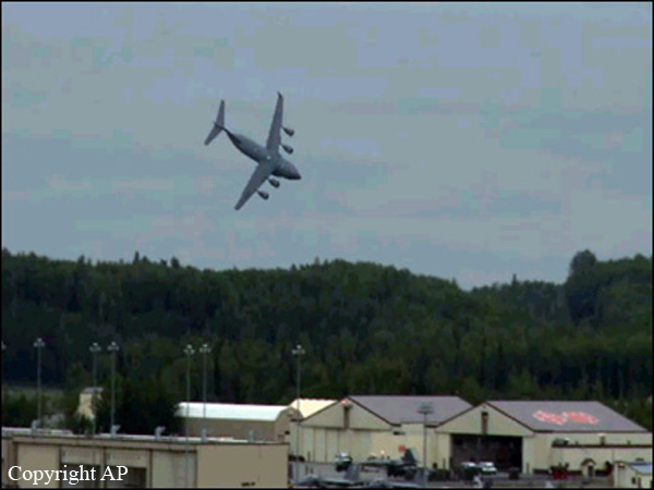The crew was engaged in a training exercise in preparation to the 'Thunder Air Show' taking part at Elmendorf-Richardson AFB on 31JUL2010. Shortly after take off from runway 06, the pilot-in-command initiated a first turn to the left then a steep turn to the right when the aircraft entered an uncontrolled descent and crashed in a huge explosion in a wooded area located some 3 km northwest of the airbase. The aircraft was totally destroyed by impact forces and a post crash fire and all four crew members were killed.