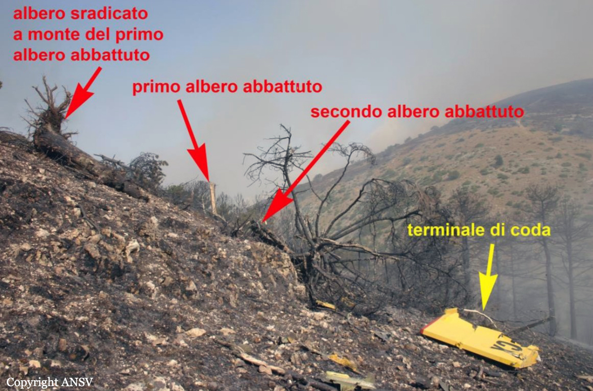The crew departed Pescara-Liberi Airport at 1719LT on a fire fighting mission in the Sirente-Velino Regional Natural Park under callsign CAN19. While approaching the area under fire, the aircraft initiated a slight turn to the right when it collided with the top of a hill and disintegrated, bursting into flames. The wreckage was found at an altitude of 1,155 metres near Acciano. While the copilot was seriously injured, the captain was killed.