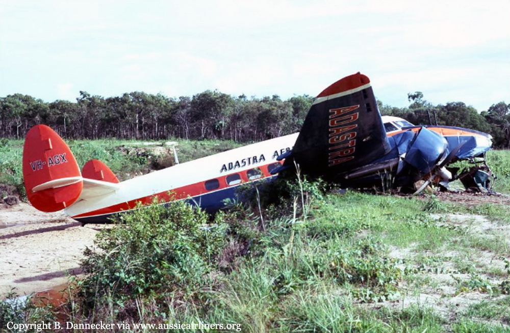 "The aircraft was temporarily based at the Weipa Mission aerodrome, northern Queensland, with the normal crew consisting of a pilot, a navigator and a photographic assistant. On the day before the accident the aircraft was flown on a private flight from Weipa Mission to the Horn Island aerodrome with three non-paying passengers aboard in addition to the crew. The aircraft remained overnight at Horn Island, and early on the following morning took off with the normal crew, and carried out survey work over a period of some four hours. The aircraft returned to Horn lsland at about midday and was refueled. During the same morning another Hudson aircraft (VH-SMM of WWAS. Ed.) engaged on photographic survey work had arrived at the aerodrome and the two crews lunched together. Both aircraft were prepared for departure and the three passengers again boarded the Weipa Mission aircraft, which took-off first and set course at 1518 hours E.S.T. intending to climb to 7,000 feet en route for Weipa, 45 minutes flying time to the south. Five minutes after departure the pilot of this aircraft advised the communication station at Thursday Island that trouble had developed in the port engine and that he was returning, to land at Horn Island. He also asked that the other Hudson aircraft be held on the ground in case some assistance was needed. At the stage that this message was relayed to the captain of the second Hudson the aircraft was lined up for take-oft but immediately vacated the strip. The captain watched the circuit and approach of the other aircraft from a position clear of, but adjacent to, the threshold of Runway 08. The returning aircraft was seen to cross Runway 08 and then turn downwind at a height of 1,500-1,700 feet and proceed with a left-hand circuit towards the threshold of that runway. As the aircraft turned on to final approach at about the normal distance from the threshold but still unusually high, the ground observers noticed that the undercarriage had not been extended. The aircraft continued to descend in this configuration and it seemed likely at this stage that a wheels-up landing would be made well down the strip. When the aircraft had reached a point approximately 600 feet from the threshold and 150 feet above ground level the undercarriage was observed to extend and it was also noticed that the port propeller was feathered. At this point there appeared to be no wing flap extended and the aircraft crossed the strip threshold at a height of more than 100 feet and at a speed estimated to be well in excess of the normal approach speed. Soon after the aircraft had passed the threshold it was seen to roll and turn to port and this motion continued until the aircraft disappeared from view at such a height and angle of bank that an accident seemed imminent. The pilot of the Hudson on the ground immediately took-off and located the wrecked aircraft on a coral mud shelf just beyond the northern shore of the island. Ground parties discovered that the aircraft had been virtually destroyed by very high impact forces and the six occupants had lost their lives."
