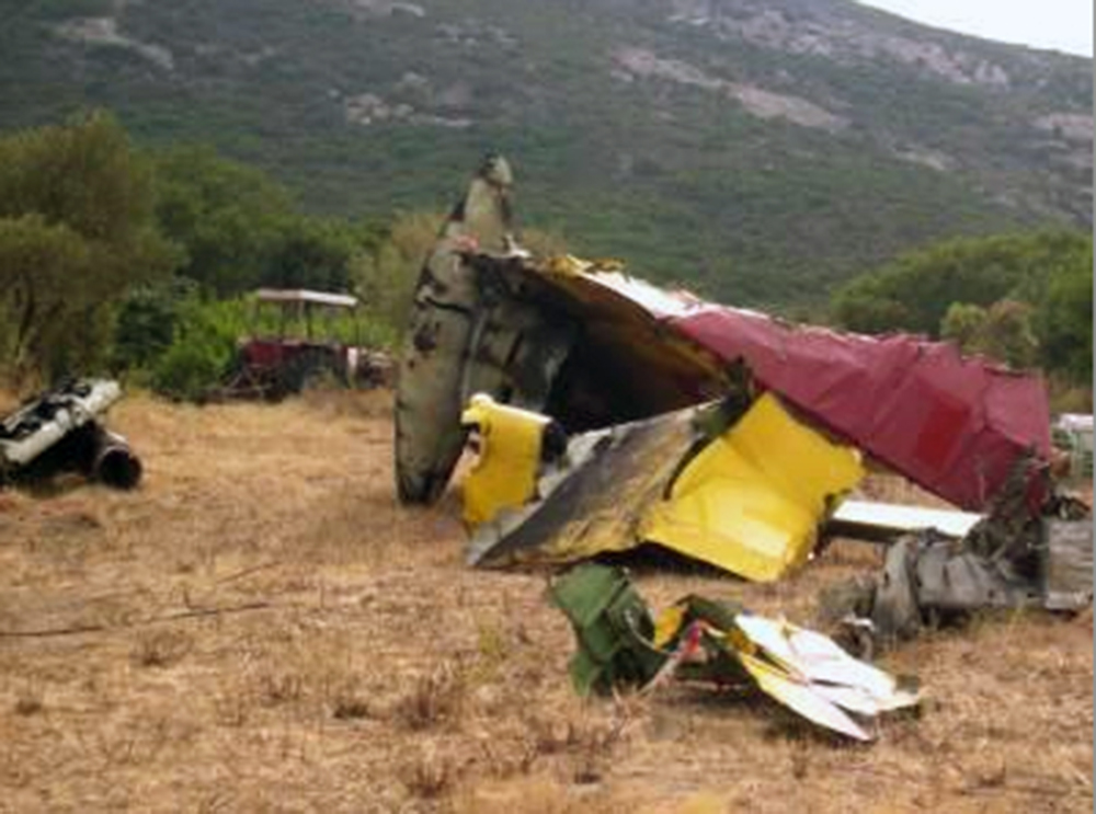 After take-off from Ajaccio Airport and a first scooping, the fleet composed of three planes with respective callsigns Pelican 44, Pelican 36 and Pelican 37 intervened on a fire at Piétramaggiore, near Calvi, Corsica, France. A first sector of the fire zone was treated by six passes. During the two following passages, the fleet dropped on another sector of the fire. Pelican 36 began its last scooping in the Gulf of Revellata at heading 250°, three minutes and fourteen seconds before the accident. At the end, it gained height and continued the circuit to arrive on the drop axis. The "doubling" action consists of releasing the water load at the precise location of the previous aircraft's release. During the last turn, it reached an altitude of 2,160 feet. Pelican 36 was observed on a trajectory estimated to be consistent by the crew of the following aircraft (Pelican 37) a few seconds before it passed over the drop site. However, video evidence shows that the track of Pelican 36 is further west than that of Pelican 44, which preceded it, and over higher terrain. One and a half seconds before the flight recorder stopped, the aircraft was in a right turn at an altitude of 1,360 feet. The angle of roll to the right and increasing was then 17°. While the elevators were nearly stable, the altitude stored by the flight recorder increased to 1,500 feet in one and a half seconds. After that the tail section of the aircraft separated from the fuselage. The aircraft then impacted the side of a mountain and broke up.
