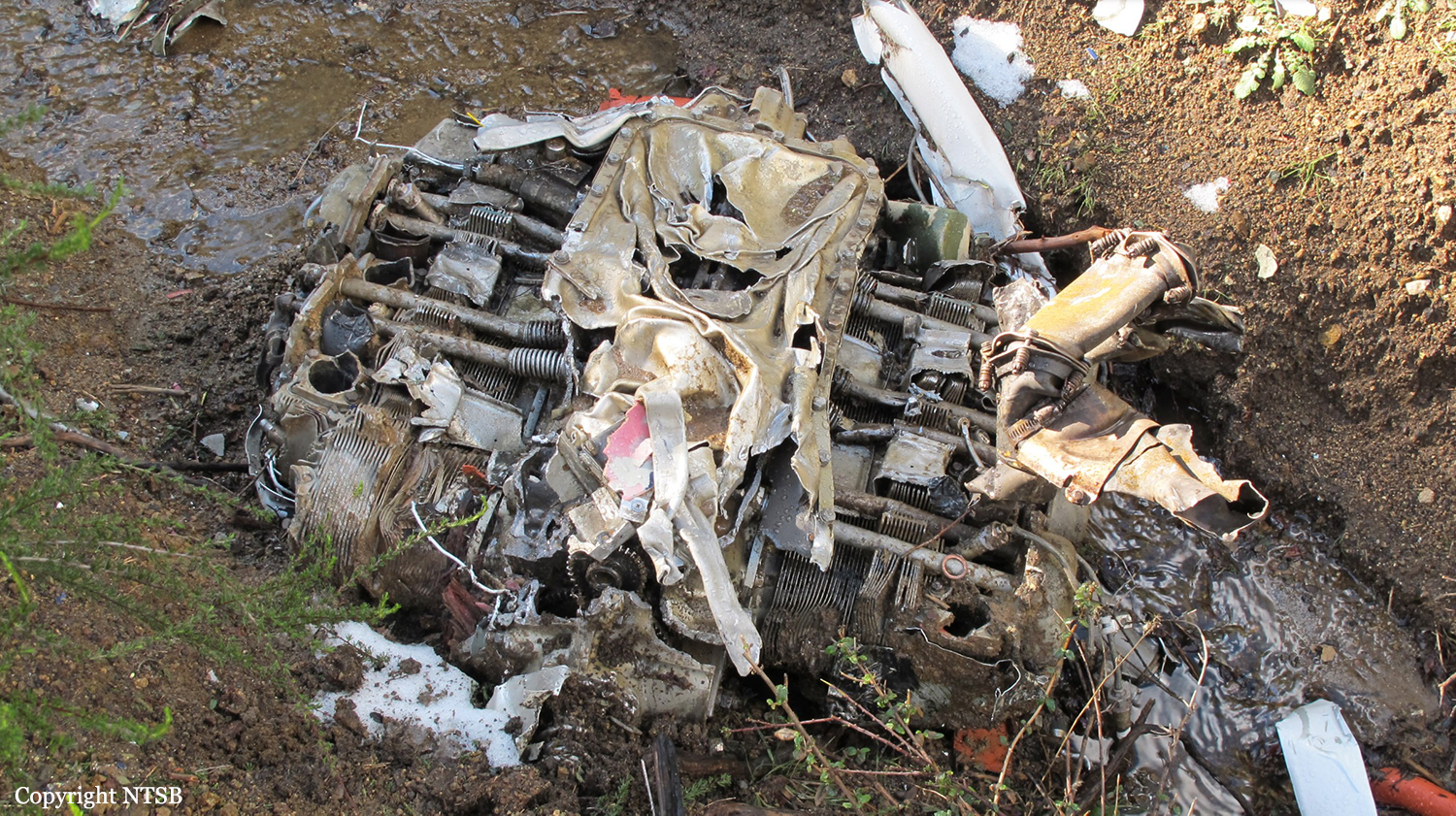 The left engine tearaway following the in-flight separation of the propeller blade due to fatigue fracture.