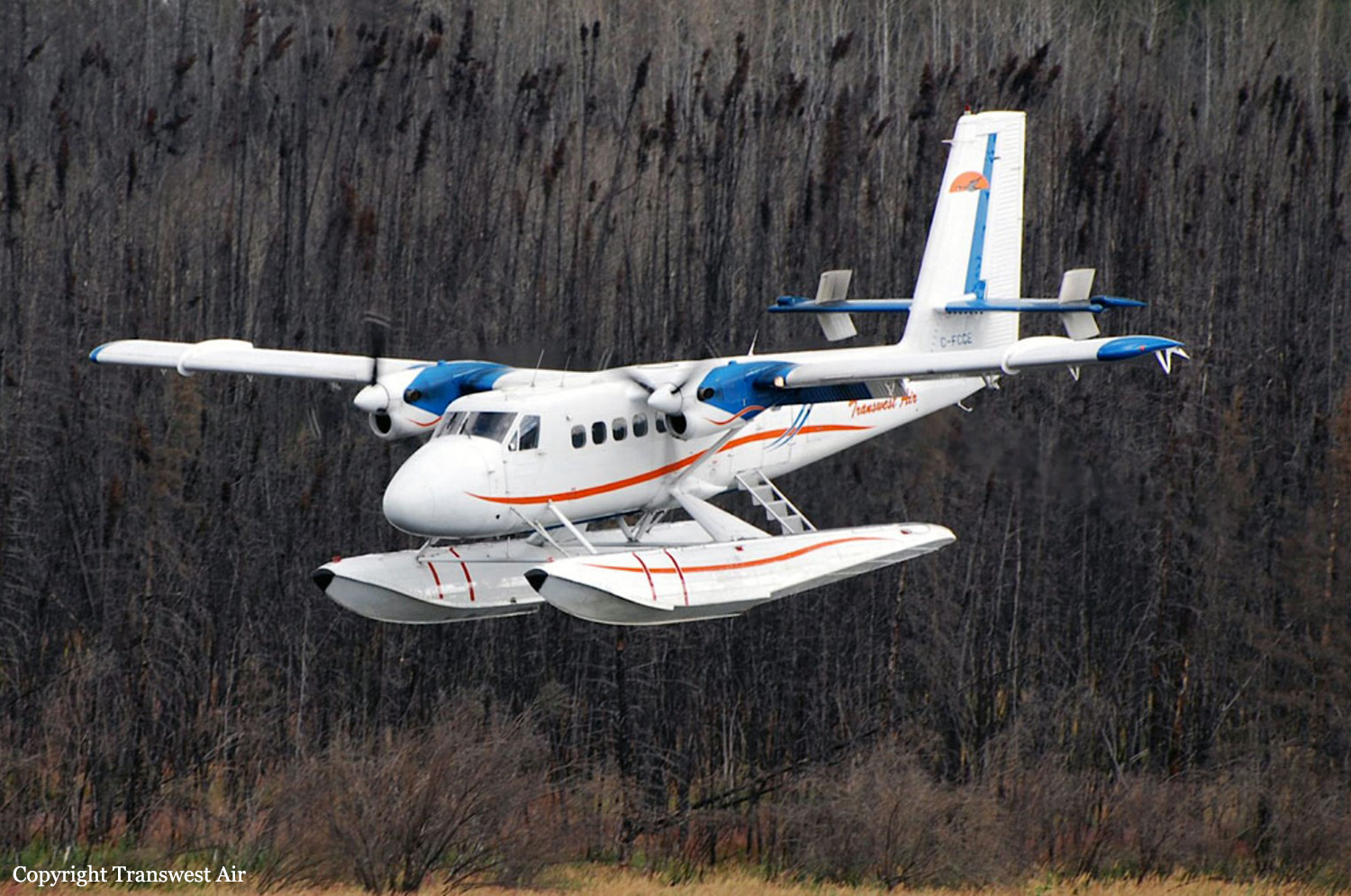 The aircraft was taking off from a ski strip east of and parallel to Runway 36 at La Ronge. After the nose ski cleared the snow, the left wing rose and the aircraft veered to the right and the captain, who was the pilot flying, continued the take-off. The right ski, however, was still in contact with the snow. The aircraft became airborne briefly as it cleared a deep gully to the right of the runway. The aircraft remained in a steep right bank and the right wing contacted the snow-covered ground. The aircraft flew through a chain link fence and crashed into trees surrounding the airport. The five passengers and two crewmembers evacuated the aircraft with minor injuries. There was a small fire near the right engine exhaust that was immediately extinguished by the crew.