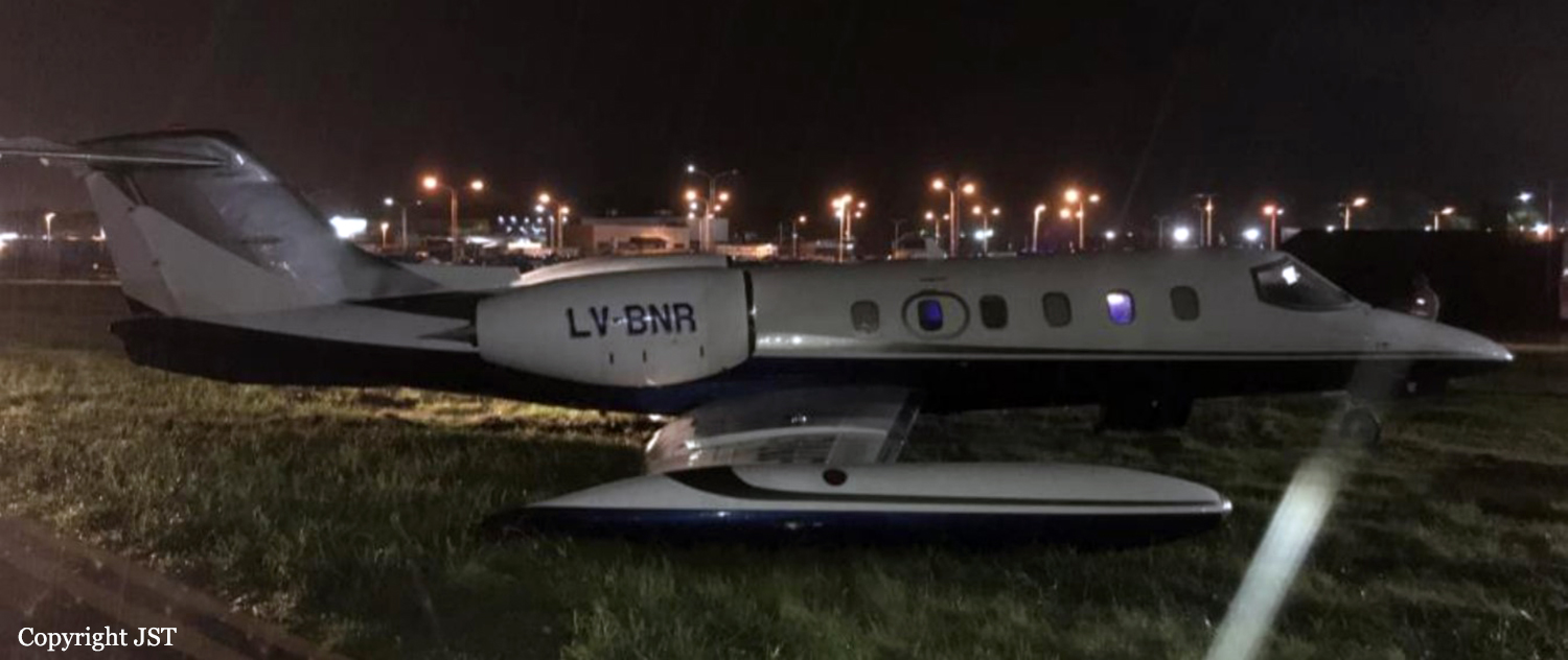 The crew was completing a positioning flight from Punta del Este to the airport of San Fernando in Buenos Aires. After landing on runway 05, the crew initiated the braking procedure but, for unknown reasons, the airplane was unable to stop within the remaining distance (runway 05 is 1,690 metres long). After the airplane overran the runway, the crew turned to the right to avoid runway 23 landing equipment. The airplane rolled for about 200 metres in a grassy area, crossed the perimeter fence and a small road before crashing in a street, bursting into flames. The airplane was totally destroyed and both pilots were killed. The airplane was owned by the Argentinian company New Lines, property of the businessman Jorge Pablo Brito.
