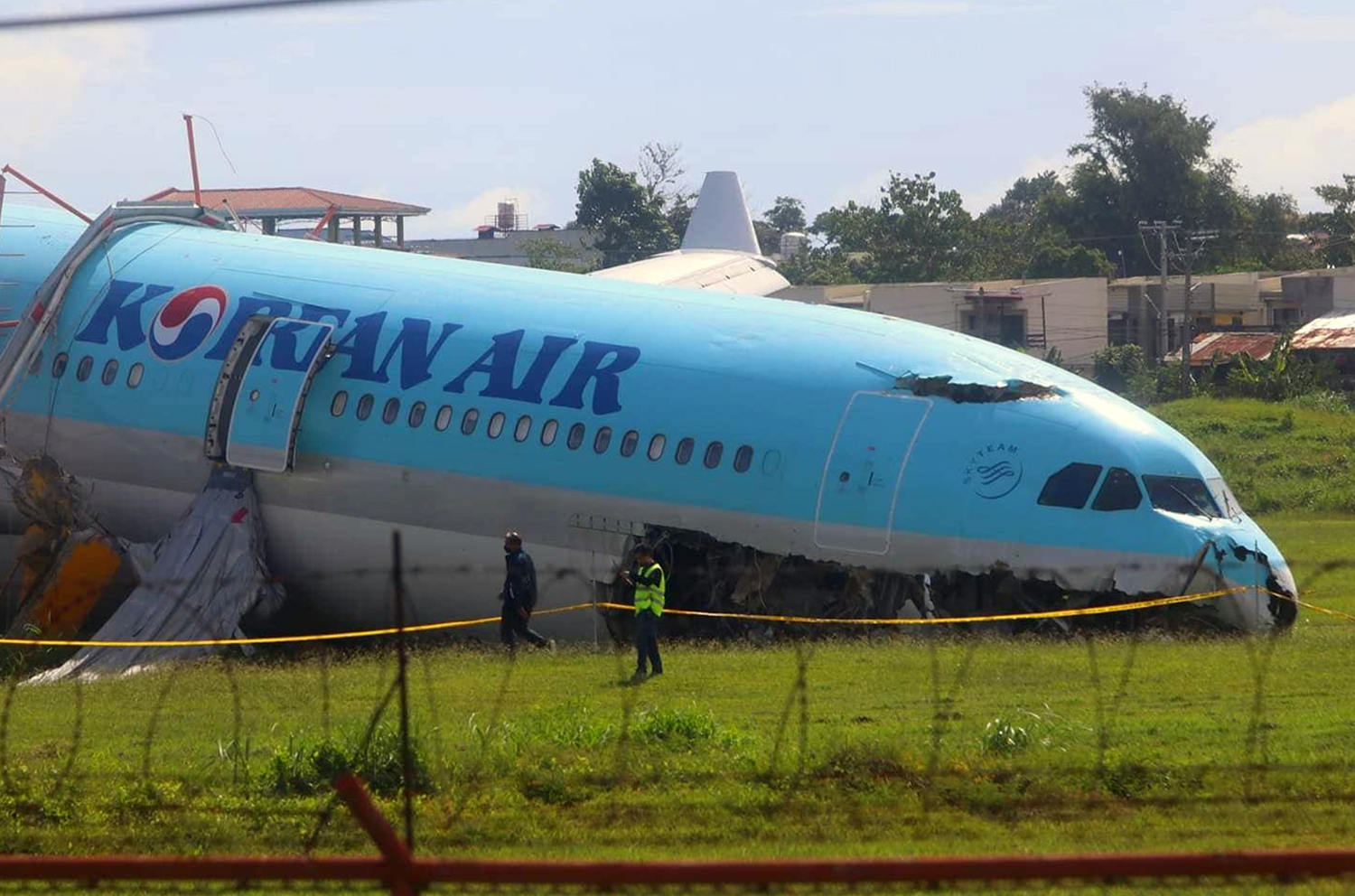 On August 16, 2018, about 1555UTC/2355H local time, a Boeing 737-800 type of aircraft with Registry No. B-5498 operating as flight CXA 8667 sustained substantial damage following a runway excursion after second approach while landing on Runway 24 of Ninoy Aquino International Airport (NAIA), Manila, Philippines. The flight was a scheduled commercial passenger from Xiamen, China and operated by Xiamen Airlines. The one hundred fifty-seven (157) passengers and two (2) pilots together with the five (5) cabin crew and one air security officer did not sustain any injuries while the aircraft was substantially damaged. An instrument flight rules flight plan was filed. Instrument Meteorological Conditions (IMC) prevailed at the time of the accident. During the first approach, the Captain who was the pilot flying aborted the landing at 30 feet Radio Altitude (RA) due to insufficient visual reference. A second approach was considered and carried out after briefing the First Officer (FO) of the possibility of another aborted landing should the flight encounter similar conditions. The briefing included a diversion to their planned alternate airfield. The flight was “stabilized” on the second approach with flaps set at 30 degrees landing position, all landing gears extended and speed brake lever appropriately set in the ARM position. On passing 1,002 feet Radio Altitude (RA), the autopilot was disengaged; followed by the disengagement of the auto-throttle, three (3) seconds later. The ILS localizer lateral path and Glide slope vertical path were accurately tracked and no deviations were recorded. The “reference” landing speed for flaps 30 for the expected aircraft gross weight at the time of landing was 145 knots and a target speed of 150 knots was set on the Mode Control Panel (MCP). The vertical descent rate recorded during the approach was commensurate with the recommended descent rate for the profile angle and ground speed; and was maintained throughout the approach passing through the Decision Altitude (DA) of 375 feet down to 50 feet radio altitude (RA). As the aircraft passed over the threshold, the localizer deviation was established around zero dot but indicated the airplane began to drift to the left of the centerline followed by the First Officer (FO) making a call out of “Go-Around” but was answered by the Captain “No”. The throttle levers for both engines were started to be reduced to idle position at 30 feet RA and became fully idle while passing five (5) feet RA. At this point, the aircraft was in de-crab position prior to flare. At 13 feet RA, the aircraft was rolling left and continuously drifting left of the runway center line. At 10 feet RA another call for go-around was made by the FO but was again answered by the Captain with “No” and “It’s Okay”. At this point, computed airspeed was approximately 6 knots above MCP selected speed and RA was approaching zero feet. Just prior to touchdown, computed airspeed decreased by 4 knots and the airplane touched down at 151 knots (VREF+6). The wind was recorded at 274.7 degrees at 8.5 knots. Data from the aircraft’s flight data recorder showed that the aircraft touched down almost on both main gears, to the left of the runway centerline, about 741 meters from the threshold of runway 24. Deployment of the speed brakes was recorded and auto brakes engagement was also recorded. The auto brakes subsequently disengaged but the cause was undetermined. Upon touchdown, the aircraft continued on its left-wards trajectory while the aircraft heading was held almost constant at 241 degrees. After the aircraft departed the left edge of the runway, all landing gears collided with several concrete electric junction boxes that were erected parallel outside the confines of the runway pavement. The aircraft was travelling at about 147 knots as it exited the paved surface of the runway and came to rest at approximately 1,500 meters from the threshold of Runway 24, with a geographical position of 14°30’23.7” N; 121°0’59.1” E and a heading of 120 degrees. Throughout the above sequence of events from touchdown until the aircraft came to a full stop, the CVR recorded 2 more calls of “GO-AROUND” made by the FO. Throughout the landing sequence, the thrust reversers for both engines were not deployed. Throttle Lever Position (TLP) were recorded and there was no evidence of reverse thrust being selected or deployment of reversers. After the aircraft came to a complete stop, the pilots carried out all memory items and the refence items in the evacuation non-normal checklist, which includes extending the flaps to a 40 degrees position. The aircraft suffered total loss of communication and a failure in passenger address system possibly due to the damage caused by the nose gear collapsing rearwards and damaging the equipment in the E/E compartment or the E-buss wires connecting the Very High Frequency (VHF) 1 radio directly to the battery was broken. The Captain then directed the FO to go out of the cockpit to announce the emergency evacuation. The cabin crew started the evacuation of the passengers utilizing the emergency slides of the left and right forward doors. There were no reported injuries sustained by the passengers, cabin crew, flight crew or the security officer.