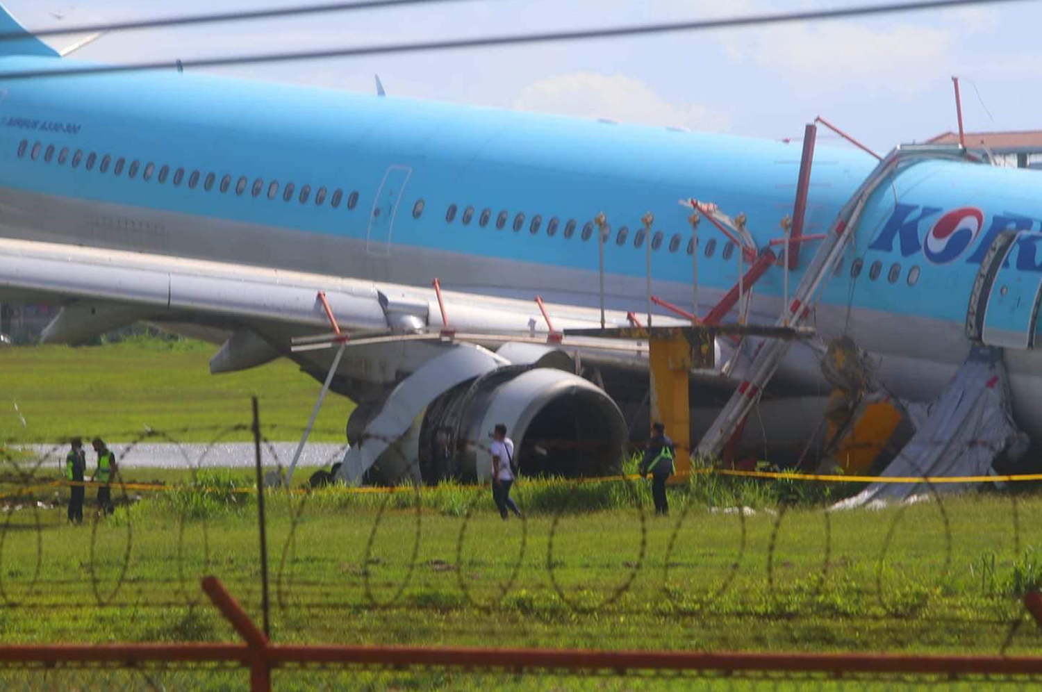 On or about 2310LT (1510 UTC), October 23, 2022, an Airbus 330-322 type of aircraft with registry number HL7525 experienced a runway overrun during landing roll at Runway (RWY) 22 of Mactan-Cebu International Airport (RPVM), Lapu-lapu City, Cebu, Philippines. The aircraft is being operated by Korean Air. One (1) flight crew member, four (4) cabin crew members, and fifteen (15) passengers sustained minor injuries. The aircraft sustained damage and was subsequently destroyed. Instrument Meteorological Conditions (IMC) prevailed at the time of the accident. The flight took off from Incheon International Airport (RKSI), Incheon, Korea. The captain was the pilot flying (PF) when the accident happened. There was a change of runway in use from RWY 04 to RWY 22 as the variable winds shifted direction favorable to RWY 22 during the first approach for landing. While on approach for landing, after descending below the minima, during the interview, the crew encountered heavy rain and elected to go around as they lost runway visibility. A second (2nd) approach was flown, and a second (2nd) go-around at 14:26:23 UTC was performed due to a sudden increase of vertical speed followed by an aural warning “Sink rate.” While initiating the go-around, the aircraft landing gears contacted the ground. An Electronic Centralized Aircraft Monitor (ECAM) message was noted by the crew indicating a landing gear control interface unit (LGCIU) 1 and 2 fault. After reporting the go-around to the air traffic controller (ATC), the crew requested to hold over reporting point ALMAR and performed ECAM actions. While performing ECAM action on the LGCIU 1 and 2 fault, an ECAM message of BRAKES ANTI SKID FAULT was noticed. These two (2) messages were displayed to the flight crew only at 1,500 ft RA (as inhibited below), i.e., 32 seconds after the touchdown, and a third (3rd) approach for landing was decided. While initiating the third (3rd) approach for landing, the crew performed a normal landing gear down procedure in accordance with ECAM actions for LGCIU 1 and 2 faults at 14:44.29 UTC. However, the right main landing gear down-lock indicator was not illuminating on the L/G indicator panel. The crew requested from ATC to cancel the approach clearance and requested again hold over reporting point ALMAR at 14:45.30 UTC to resolve the technical issue. After the crew carried out the QRH procedure for landing with abnormal landing gear, an indication of the HYD B RSVR LO LVL message was displayed. The crew then performed another ECAM action. The flight then continued its approach to RPVM. During landing on the fourth (4th) approach, the aircraft failed to stop and overran the end of the runway. After colliding with the localizer antenna and runway approach lighting system, the aircraft came to a complete stop at the grassy portion about 235 meters from the end of runway 22 at coordinates 10o17’41.8” N 123o57’59.9” E with a final heading of 245°. The passengers evacuated utilizing the L2 and R2 cabin door slide rafts. The crew and passengers were ferried to the airport terminal by shuttle buses. Mactan Cebu International Airport Authority (MCIAA) Rescue and Firefighting Services immediately responded to help secure the aircraft. There was no fire ensued after the accident.