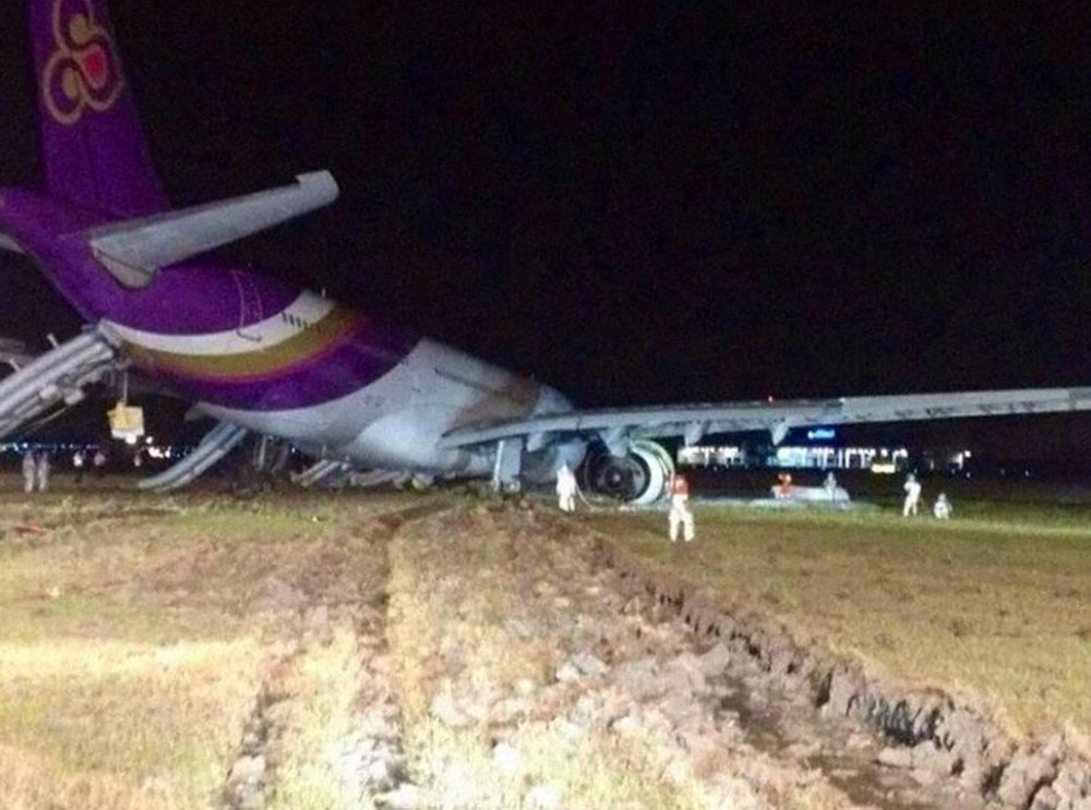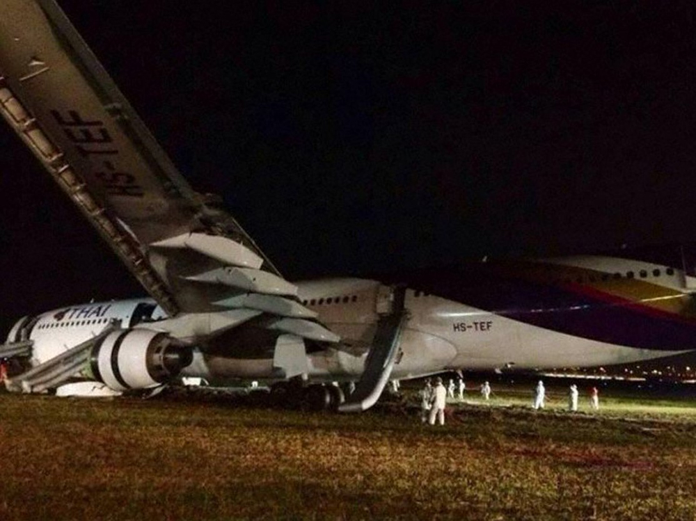 Following an uneventful night schedule service from Guangzhou, the crew was cleared for an ILS approach to runway 19L at Bangkok-Suvarnabhumi Airport. Following a smooth landing, the crew started the braking procedure when, after a course of about 1,000 metres, the aircraft deviated to the right then veered off runway. While contacting soft ground, the nose gear collapsed, the aircraft sank in earth and came to rest with both engines in flames. All 302 occupants were rescued, among them 14 passengers were injured. The aircraft was damaged beyond repair.