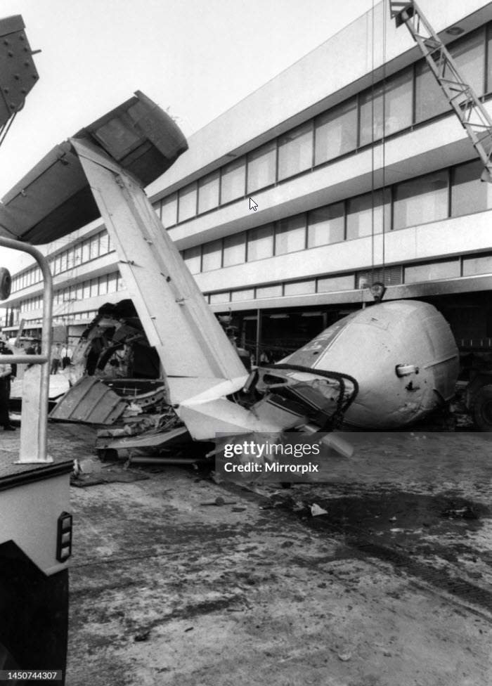 The aircraft left Deauville at 1535 hrs., on flight No. C.6845, and made an uneventful flight to London at flight level 70. It was cleared to land on runway 28 Right and at 1624 hrs, reported passing the outer marker inbound. The approach proceeded normally and the aircraft came into the view of air traffic control personnel in the tower when it was about 200 feet, and close to the airport boundary. It was then in a normal approach attitude. However, at a position near the threshold of runway 28 Right the port wing was seen to drop and the aircraft turned slowly to the left off the runway centerline. The bank increased and the port wing tip, followed by the port main wheels, touched the grass surface of the aerodrome. Witnesses near to the runway threshold heard engine power applied as if for an overshoot and the aircraft then became airborne again and with the bank further increasing, it flew towards the partly constructed No.I terminal building on the northeast side of the airport central area. Whilst still steeply banked it struck two British European Airways Trident aircraft, which were parked at a pier of the terminal building, and burst into flames. The aircraft then rolled on to its back and after demolishing a twelve foot high metal blast barrier came to rest against the ground floor of the terminal building between two of the embarkation piers. 27 people on the ground in the area received slight injuries, 2 people were seriously injured. Six occupants were killed while two others were killed as well as all eight horses. The Trident registered G-ARPT was also destroyed while the Trident registered G-ARPI was repaired.