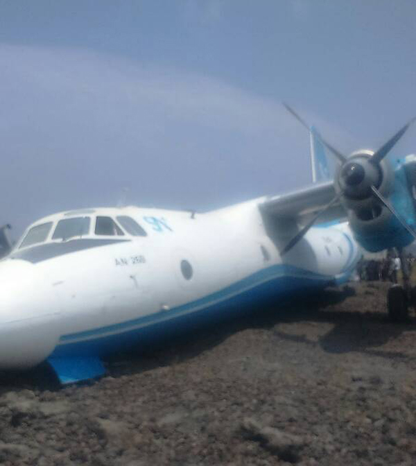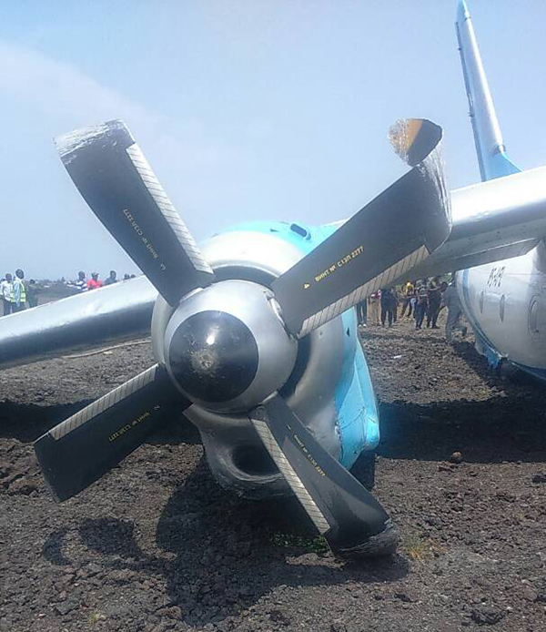 Shortly after takeoff from Goma Airport, while on a cargo flight to Bunia, the crew reported technical problems with the right engine and was cleared to return for an emergency landing. The crew landed long (about half way down the runway) and after touchdown, the airplane was unable to stop within the remaining distance. It overran and while contacting lava ground, the right main gear and the nose gear collapsed. The airplane came to rest with its right wing bent and all four crew members evacuated safely.