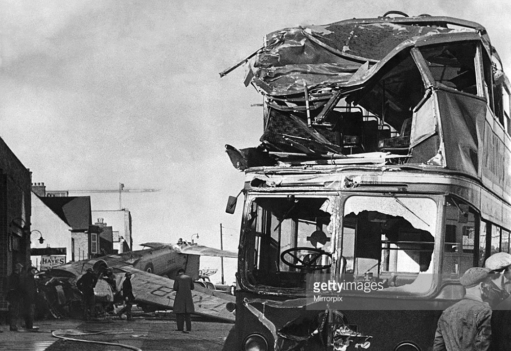 On final approach to RAF Hendon, while performing a local training sortie, the aircraft stalled and hit several buildings located 1'100 yards short of the runway threshold. On impact, the aircraft nosed down and crashed on a trolleybus. Both pilots were killed while eight civilians seating in the trolleybus were seriously injured.