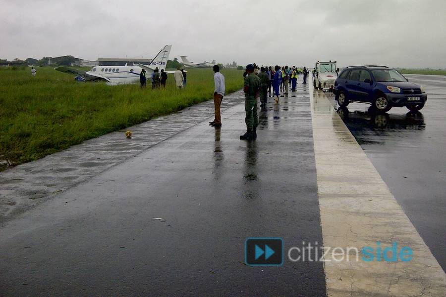 Following an uneventful flight from Moanda, Gabon, the crew initiated the approach in poor weather conditions (rain falls, strong crosswinds and turbulences). After touchdown, the twin engine aircraft skidded then veered off runway to the left. While contacting soft ground, the landing gear collapsed and the left engine was partially torn off. All 10 occupants escaped uninjured while the aircraft was damaged beyond repair. Wind shear conditions are suspected.