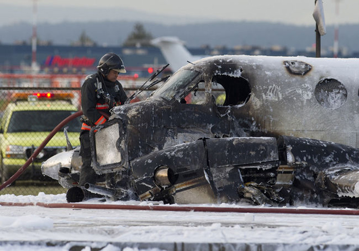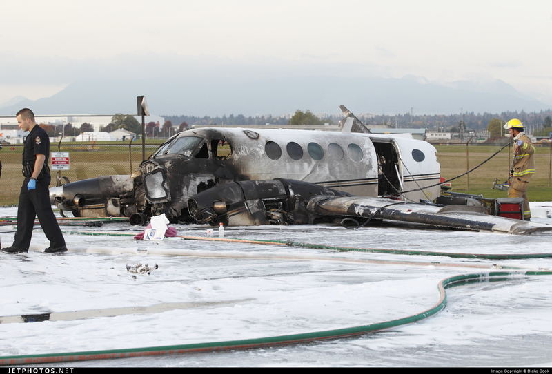 The Northern Thunderbird Air Incorporated Beechcraft King Air 100 (serial number B-36, registration C‑GXRX) departed Vancouver International Airport for Kelowna, British Columbia, with 7 passengers and 2 pilots on board. About 15 minutes after take-off, the flight diverted back to Vancouver because of an oil leak. No emergency was declared. At 1611 Pacific Daylight Time, when the aircraft was about 300 feet above ground level and about 0.5 statute miles from the runway, it suddenly banked left and pitched nose-down. The aircraft collided with the ground and caught fire before coming to rest on a roadway just outside of the airport fence. Passersby helped to evacuate 6 passengers; fire and rescue personnel rescued the remaining passenger and the pilots. The aircraft was destroyed, and all of the passengers were seriously injured. Both pilots succumbed to their injuries in hospital. The aircraft’s emergency locator transmitter had been removed.