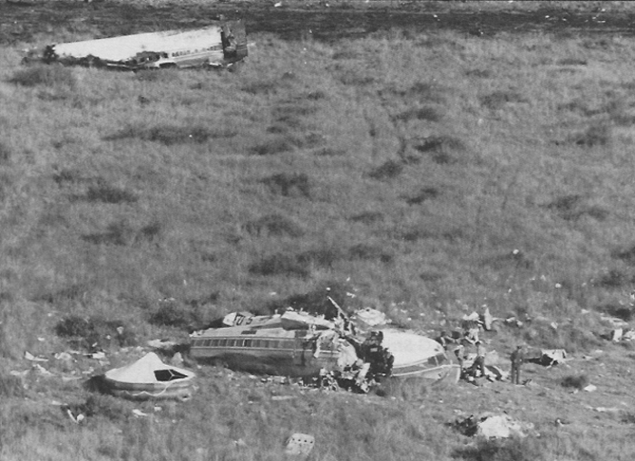 A Boeing 707-344C passenger jet, registered ZS-EUW, was destroyed in an accident near Windhoek-Strijdom International Airport, Namibia. The aircraft was operating on South African Airways' flight SA228 from Johannesburg to London via Windhoek, Luanda, Las Palmas and Frankfurt. The first leg of the flight was uneventful. Local weather conditions at Windhoek were fine: there was no cloud and no wind. The night was particularly dark as there was no moon and the horizon was indistinct. At 20:49 the aircraft took off from Windhoek runway 08 into conditions of complete darkness. The aircraft climbed to a height of about 650 feet above ground level. It leveled off and began to descend. Thirty seconds later, the aircraft flew into the ground at a point some 5,327 metres from the end of the runway. The level of the ground at the point of impact was 179 feet below the airport elevation or approximately 100 feet below the point of lift-off. The impact occurred at a ground speed of approximately 271 knots. The initial impact was in a slightly left-wing-down attitude. The fuselage and each of the 4 engine pods gouged deep trenches in the ground and the aircraft then began to break up as its momentum carried it onward. Wreckage was strewn over an area some 1,400 metres long and some 200 metres wide, and 2 separate fires broke out, presumably through the ignition of fuel on impact. Five passengers were seriously injured while 123 other occupants were killed.