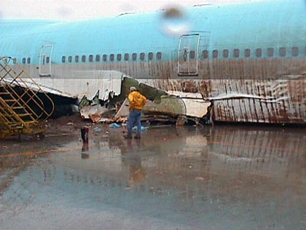 Originally, the flight was a direct one from Tokyo-Narita to Seoul but due to poor weather conditions at destination, the crew diverted to Jeju. The aircraft departed Jeju Airport at 2107LT on the final leg to Seoul-Gimpo Airport. At destination, weather conditions were still poor with heavy rain falls and wind from 220 gusting to 22 knots. After touchdown on runway 14R, the crew started the braking procedure but the aircraft deviated to the right and veered off runway. While contacting soft ground, the aircraft lost its undercarriage and came to rest. All 395 occupants evacuated, among them 20 were slightly injured. The aircraft was damaged beyond repair.