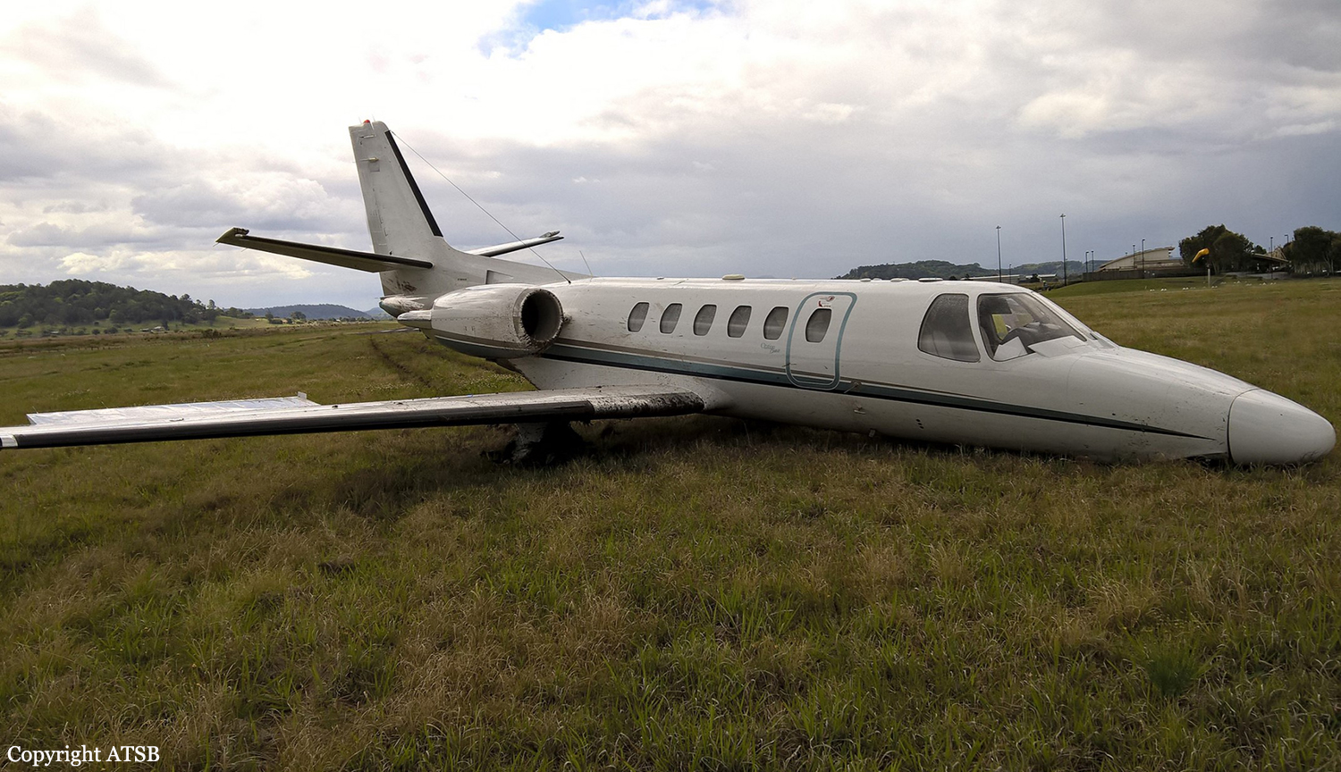 On the morning of 25 September 2015, the captain and copilot of a Cessna 550 aircraft (Citation Bravo), registered VH-FGK, prepared to conduct a private flight from Lismore Airport to Baryulgil, about 40 NM south-west of Lismore, New South Wales. The aircraft had been parked at the northern end of the airport overnight, with engine covers and control locks on. After arriving at the airport, the flight crew conducted a pre-flight inspection, with no abnormalities identified. They then commenced the normal pre-start checks, which included the disengagement of the flight control locks. The crew elected to use runway 15 for take-off, and used the Cessna simplified take-off performance criteria (see Take-off performance simplified criteria) to determine the thrust settings and take-off reference speeds. The resultant reference speeds were 105 kt for the decision speed (V1) and 108 kt for the rotation speed (VR). At about 1300 Eastern Standard Time, the flight crew started the engines and performed the associated checks, with all indications normal. The crew reported that they completed the after start checks, and the captain then taxied the aircraft to the holding point for runway 15, less than 200 m from where the aircraft was parked. While stopped at the holding point, the crew completed the taxi and pre-take-off checks, the copilot broadcast the standard calls on the common traffic advisory frequency, and the captain communicated with air traffic control (ATC). The captain taxied the aircraft onto the runway, and turned left onto the runway centreline to commence the take-off run from the intersection. While rolling along the runway, the captain advanced the thrust levers to the approximate take-off setting. The captain then called ‘set thrust’, and the copilot set the thrust levers to the more precise position needed to achieve the planned engine thrust for the take-off. As the aircraft accelerated, the copilot called ‘80 knots’ and crosschecked the two airspeed indicators were in agreement and reading 80 kt. The copilot called ‘V1’ and the captain moved their hands from the thrust levers to the control column in accordance with the operator’s normal procedure. A few seconds later, the copilot called ‘rotate’ and the captain initiated a normal rotate action on the control column. The crew reported that the aircraft did not rotate and that they did not feel any indication that the aircraft would lift off. The copilot looked outside and did not detect any change in the aircraft’s attitude as would normally occur at that stage. The captain stated to the copilot that the aircraft would not rotate, and pulled back harder on the control column. The copilot looked across and saw the captain had pulled the control column firmly into their stomach. Although the aircraft’s speed was then about 112 kt, and above VR, the crew did not detect any movement of the attitude director indicator or the nose wheel lifting off the ground, so the captain rejected the take-off; applied full brakes, and set the thrust levers to idle and then into reverse thrust. The aircraft continued to the end of the sealed runway and onto the grass in the runway end safety area (RESA), coming to rest slightly left of the extended centreline, about 100 m beyond the end of the runway. The aircraft sustained substantial damage and the flight crew, who were the only occupants of the aircraft, were uninjured. The nose landing gear separated from the aircraft during the overrun, and there was significant structural damage to the fuselage and wings. The right wheel tyre had deflated due to an apparent wheel lockup and flat spot, which had progressed to a point that a large hole had been worn in the tyre.