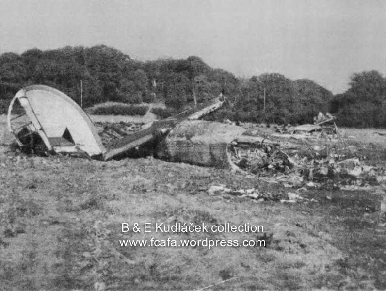 Shortly after takeoff from Blackbushe, while in initial climb, the engine number two caught fire. The aircraft stalled and crashed in a huge explosion in a field located 2 miles from the airport. The aircraft was destroyed by impact forces and a post crash fire and all 23 occupants were killed. All of them were Czech citizens being repatriated to their country at the war's end, among them 5 kids.
