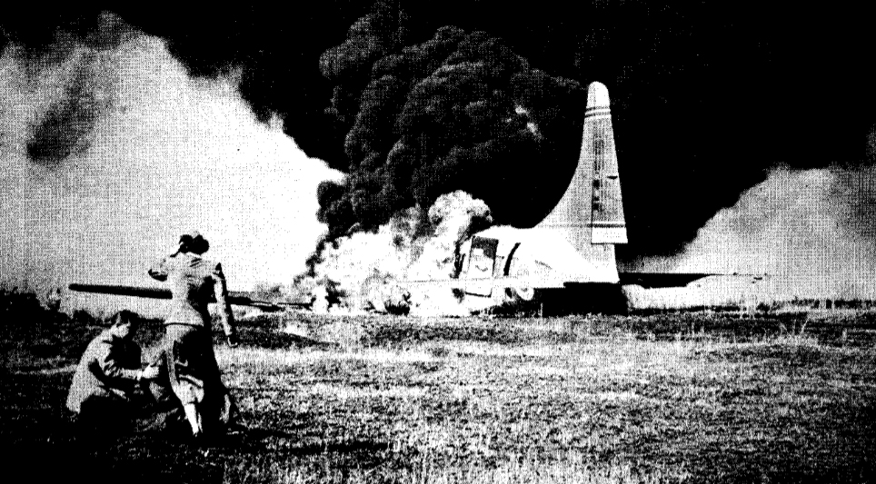 The flight departed Minneapolis, Minnesota, at 0746LT, bound for Houston, Texas, via schedules intermediate points. A crew change was made at Kansas City, Missouri, and no mechanical discrepancies were reported by the incoming crew with the exception that the left engine torque meter pressure indication was approximately 90 FSI, the normal being approximately 145 PSI The flight departed Kansas City and proceeded in a routine manner to Tulsa, arriving at 1244. The left engine, torque meter pressure indicator was considered inoperative because of its low reading, and was, therefore, disregarded during the flight 2. Following touchdown at Tulsa, the propellers were placed in reverse thrust, and when being returned to positive thrust, the left propeller went to the full feathered position and the engine ceased operation. While taxiing to the loading ramp, attempts were made to start the left engine but were not successful. On departure from Tulsa, no difficulty was encountered in starting the left engine, and the propeller which was in the full feathered position was returned to the low pitch position by use of the propeller governor control. Take-off was accomplished from Tulsa at 1302LT, with 29 passengers, including one infant, and a flight crew consisting of Paul C. Walters, captain, Forrest A. Hull, copilot, Cecelia Littell and loan Stoltenberg, the two stewardesses. Total aircraft weight was 40,304 pounds, which was within the allowable gross weight of 40,500 pounds, and the load was distributed so that the center of gravity was within the certificated limits. Prior to take-off, the engines were run up and the pre-flight check accomplished using a check list. All items checked satisfactorily, with the exception that the left engine torque meter pressure indicator was abnormally low. Flaps were positioned at 24 degrees for take-off. The take-of roll was started on Runway 12, and the signal devices in the cockpit indicated that the automatic feathering unit and the anti-detonation injection unit were functioning. During the take-off roll, the copilot called out the following indicated air speeds. VMC, 107 miles per hour, V1, 121 miles per hour, and V2, 122 miles per hour. The aircraft became airborne at 124 miles per hour, or slightly higher. The landing gear was immediately retracted and the air speed was then observed to be 145 miles per hour at this time, at an altitude estimated to be not over 50 feet, the left propeller was observed to feather and then immediately to rotate slowly. It continued to rotate until the aircraft struck the ground. The crew first became aware that the left engine was malfunctioning when a severe vibration was felt immediately after the gear had been retracted and at the same time the aircraft yawed to the left momentarily. Both engine controls were left at the take-off setting, and a single-engine climb was then initiated. The air speed decreased to approximately 124 miles per hour during the climb to a maximum altitude of approximately 150 feet. At this point, since it was doubtful that this air speed could be maintained, the aircraft was leveled off and a shallow turn to the left was made to avoid flying over a building. As the aircraft started turning at an approximate air speed of 122 miles per hour, the captain, according to the copilot, gave the command to retract the flaps from the 24-degree position to the 12-degree position. The copilot states that he immediately executed the command, stopping the retraction of the flaps at 12 degrees. The captain states that he gave the following command, “ 12-degree flaps. No, leave them where they are.” However, the captain testified that the command was given when the air speed was 107 miles per hour and at a point approximately 3000 feet further along the flight path than where the copilot stated he retracted the flaps. While in the left turn, the aircraft was observed to lose altitude steadily until it struck a grove of trees at a point approximately 17 feet above the ground. After striking the trees it slid on the ground on the underside of the fuselage. All passengers and crew were evacuated safely and in an orderly manner. The aircraft was destroyed by fire.
