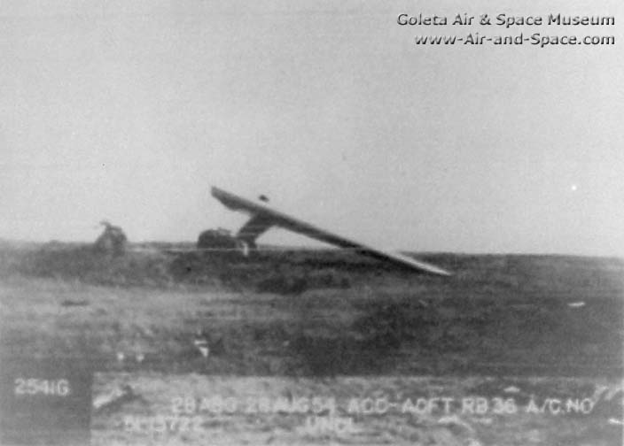 Aircraft Commander Lt Col Wray Cotterill, Pilot 1st Lt Roger Bumps, Co-pilot Captain Neal Williams and a crew of twenty-four took off in RB-36H, 51-13722 of the 77th Strategic Reconnaissance Squadron of the 28th Strategic Reconnaissance Wing from Ellsworth AFB at 4:15 in the morning on August 27, 1954. The crew had just returned from a thirty day leave. Captain Williams had finished a 20-hour mission just 32 hours earlier. Their flight took them to Kansas City, Missouri; Little Rock, Arkansas; Dallas, Texas; and back to Little Rock for radar bombing practice. They flew to Kansas City again and then returned to Ellsworth AFB after flying 3,594 air miles. At 9:00 in the evening the pilots began to practice Planned Position Indicator Ground Control Approaches (GCA PPI) using Air Surveillance Radar. They entered the pattern for Runway 12. GCA PPI was not as precise as GCA precision approach. The minimum altitude for GCA approach was 3,864 feet. The approaches were flown at 145 miles per hour. The landing gear remained retracted. The flaps were lowered to 20 degrees and the landing lights were extended. The night was clear and visibility exceeded 15 miles. During the first four approaches, Lt Bumps flew from the right seat and Captain Williams observed from the left seat. A pair of North American F-86D Sabre Dogs took off from Runway 30 at 9:30. Their pilots noticed that the red obstruction lights on a low range of hills 1-3/4 miles northwest of the runway were not working. The lead pilot notified the Ellsworth tower that the obstruction lights were out. It was not known at the time that they had been disabled by a lightning strike the night before. The civilian Senior Electrician of Air Installations was called shortly before 10:00 P.M. and notified that the obstruction lights needed to be repaired. He assembled a crew at the AIO electrical shop and prepared to drive out to the lights. On the fourth approach, ground control advised Lt Bumps that the obstruction lights northwest of the field were not working. After the fourth pass over the airfield, Col Cotterill moved into the left hand seat to fly the next approach. Col Cotterill flew the approach higher than the glide path specified by the GCA operator. Before the sixth approach, Captain Williams replaced Lt Bumps in the right hand seat. It is believed that Col Cotterill flew the next approach. The RB-36H was flying at 145 miles per hour on a heading of 147 degrees (true), descending at 750 feet per minute when the left wing struck one of the inoperative obstruction lights. Seventy feet beyond the obstruction light the lower fuselage struck the ground 8,777 feet short and 225 feet right of the centerline of Runway 12 at 10:11 P.M. Mountain Standard Time. The impact point was at an elevation of 3,394 feet, 148 feet higher than the runway. The tail section broke away from the fuselage and came to rest 275 feet from the first point of impact. E.C.M. Captain Philip Toups, 1st Lt Roger Bumps and E.C.M. A/1C John Harvey were rescued from the wreckage while 24 other occupants were killed. Cpt Toups died five days after the crash. A/1C Harvey succumbed to his injuries after six days. Eventually, only 1st Lt Roger Bumps survived the crash.