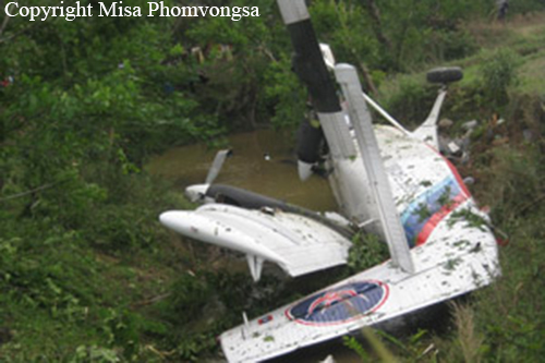 Shortly after takeoff from Sam Neua-Nathong Airport, while in initial climb, the twin engine aircraft collided with trees, lots height and crashed in a small river located 200 metres past the runway end. All 18 occupants were injured, five seriously. The aircraft was damaged beyond repair.