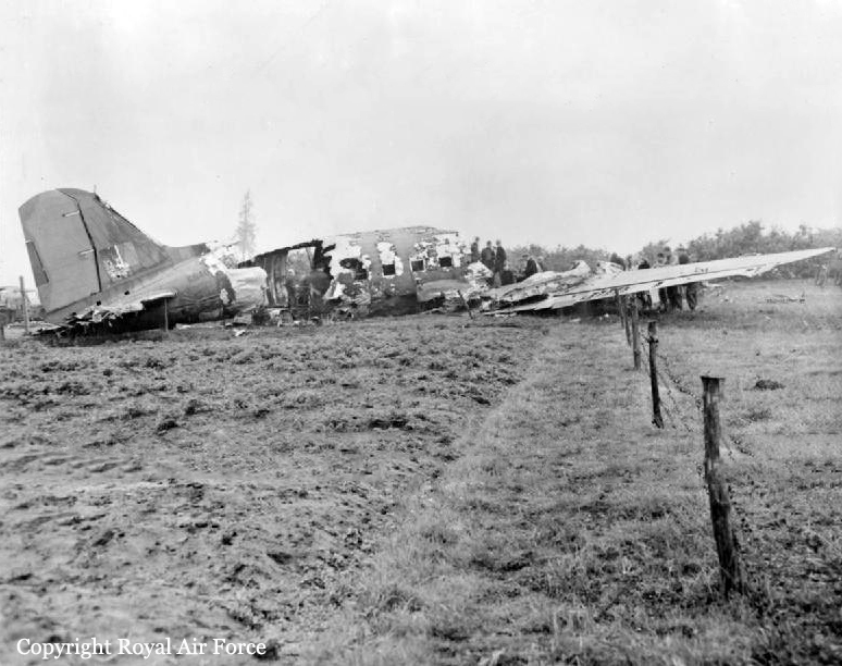 The aircraft had just dropped its supplies from 700 feet when it was met with intense anti-aircraft fire. The tail unit, rudder, port aileron and engine, the starboard auxiliary fuel tank and all the gyro instruments were either damaged or put out of action, and one of the Army dispatchers was mortally wounded. The captain, F/O L. R. Pattee and his copilot, F/O A. C. Kent, flew the crippled aircraft back to the British lines, through three more areas of enemy flak, where they sustained further serious damage, including a five foot hole in the starboard wing which caught fire, and complete electrical and communications failure. Once over the British lines, Pattee gave the crew and dispatchers the opportunity to bale out, but they refused and the pilots then made a successful belly-landing in the field. No sooner had they all quit the Dakota, than it was engulfed by flames. The unfortunate dispatcher died soon after the landing, while the others were taken to Brussels and the crew returned to RAF Down Ampney.