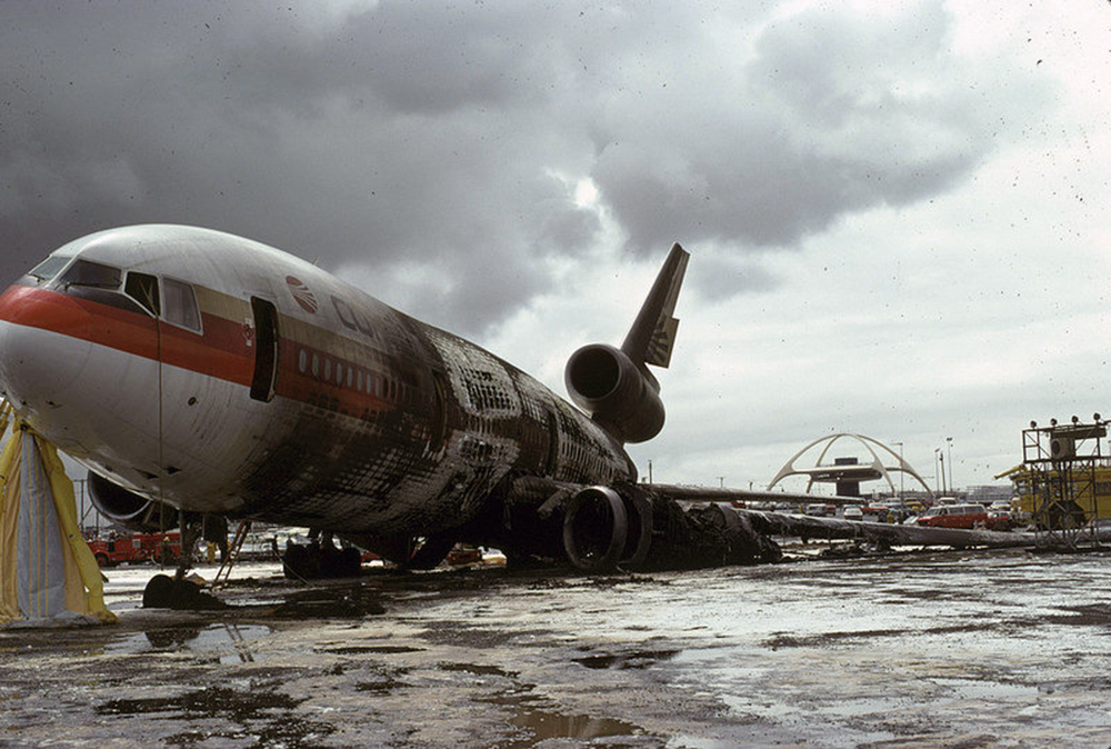 On March 1, 1978, Continental Air Lines, Inc., Flight 603, a McDonnell Douglas DC-10-10 (N68045), was a scheduled flight from Los Angeles International Airport, California, to Honolulu, Hawaii. At 0857:18, Flight 603 called Los Angeles clearance delivery and was cleared for the route of flight which was to have been flown. About 2 min later, the flight received permission from Los Angeles ground control to push back from the gate. At 0901:37, Flight 603 was cleared by ground control to taxi to runway 6R. The runway was wet, but there was no standing water. At 0922:29, Los Angeles local control cleared Flight 603 to taxi into position on runway 6R and hold. At 0923:17, local control cleared Flight 603 for takeoff; however, the flightcrew did not acknowledge the instructions and did not comply with them. At 0923:57, local acknowledged the instructions. The captain stated that he delayed control, again, cleared the flight for takeoff. This time the flightcrew acknowledgment of the takeoff clearance because he believed that he had initially been given the clearance too soon after a heavy jet aircraft had made its takeoff. The flightcrew stated that acceleration was normal and that all engine instruments were in the normal range for takeoff. As the airspeed approached the V1 speed of 156 kns, the captain heard a loud "metallic bang" which was followed immediately by "a kind of quivering of the plane." The flightcrew noticed that the left wing dropped slightly. A rejected takeoff was begun immediately; however, according to the digital flight data recorder (DFDR), the airspeed continued to increase to about 159 kns as the rejected takeoff procedures were begun. The captain stated that he applied full brake pressure while simultaneously bringing the thrust levers back to idle power. Reverse thrust levers were actuated and full reverse thrust was used. The flightcrew stated that they noted good reverse thrust. First, the aircraft moved to the left of the runway centerline and appeared tb the flightcrew to be decelerating normally. With about of deceleration had decreased, and they believed that the aircraft would 2,000 ft of runway remaining, the flightcrew became aware that the rate not be able to stop on the runway surface. The captain stated that he maintained maximum brake pedal force and full reverse thrust as he steered the aircraft to the right of the runway centerline in an effort "to go beside the stanchions holding the runway lights" immediately off of the departure end of runway 6R. He stated further that he encountered no problems with directional control of the aircraft throughout the rejected takeoff maneuver. The aircraft departed the right corner of the departure end of runway 6R. About 100 ft beyond the runway, the left main landing gear broke through the nonload-bearing tar-macadam (tarmac) surface and failed rearward. Fire erupted immediately from this area. The aircraft dropped onto the left wing and the No. 1 (left) engine and rotated to the left as it continued its slide along the surface. It stopped between two of the approach light stanchions for runway 24L about 664 ft from the departure end of runway 6R and about 40 ft to the right of the runway 6R extended centerline; it came to rest on a heading of 008°, in an 11° left wing low, 1.3° noseup attitude. When the aircraft came to a stop, the evacuation was begun immediately. Two passengers were killed while all other occupants were evacuated, some of them with serious injuries.