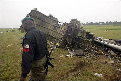 The aircraft with call sign OSL 1 145 which departed Abuja at 1225 hrs UTC (1.25 pm local time) with endurance of 2 hours 40 minutes was on a scheduled passenger flight enroute Port Harcourt with 110 Persons on Board (103 Passengers and 7 Crew) and the flight continued normally. At 1241 hours UTC, the aircraft cruising at FL240 (24,000ft) Above Sea Level (ASL) got in contact with Port Harcourt Approach Control. The Approach control gave the OSL 1145 in - bound clearance to expect no delay on ILS Approach to runway 21, QNH of 1008 and temperature of 33° C. At about 1242 hours UTC (1.42pm local), the Approach controller passed the 1230 hours UTC weather report to the aircraft as follows: Wind - 260° /02kts Visibility - 12km Weather - Nil Cloud - BKN 420m, few CB (N-SE) at 690m QNH - 1008HPA Temperature - 33° C. About 1250 hours UTC (1.50 pm local), the aircraft, which was 90 nautical miles to the station, contacted Approach Control for initial descent clearance and was cleared down to FL 160. The aircraft continued its descent until about 1300 hours UTC (2.00 pm local) when the crew asked Approach Control whether it was raining over the station to which the controller reported negative rain but scattered CB and the crew acknowledged. At 1304 hours UTC, the crew reported established on the glide and the localizer at 8 nautical miles to touch down. Then the Approach controller informed the aircraft of precipitation approaching the station from the direction of runway 21 and passed the aircraft to Tower for landing instructions. At 1305 hours UTC, the aircraft contacted Tower and reported established on glide and localizer at 6 nautical miles to touch down. The controller then cleared the airplane to land on runway 21 but to exercise caution as the runway surface was slightly wet and the pilot acknowledged. At about 1308 hours UTC, the aircraft made impact with the grass strip between runway 21 and taxiway i.e. 70m to the left of the runway edge, and 540m from the runway 21 threshold. At about 60m from the first impact, the aircraft tail section impacted heavily with a concrete drainage culvert. The airplane then disintegrated and caught fire along its path spanning over 790m. The cockpit section and the forward fuselage were found at about 330m from the rest of the wreckage further down on the taxiway creating a total wreckage trail of 1 120m. Fire and rescue operations were carried out after which 7 survivors and 103 bodies were recovered. Five of the survivors died later in the hospital. The accident occurred in `Instrument Meteorological Conditions' (IMC) during the day.