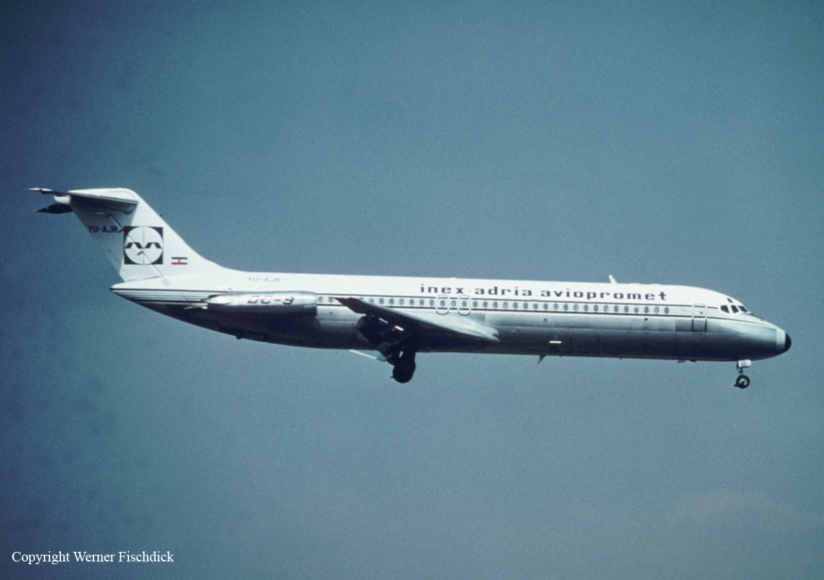 Hawker Siddeley HS-121 Trident 3B operated by British Airways as flight BE476 and a McDonnell Douglas DC-9-32, operated by Inex-Adria Aviopromet, were destroyed when both aircraft crashed near Vrobec following a mid-air collision. All 176 on board both aircraft were killed. The Trident was on a scheduled flight from London-Heathrow Airport in England to Istanbul-Yesilköy Airport in Turkey, carrying 54 passengers and a crew of 9. The aircraft took off at 08:32 GMT and the flight proceeded normally. First contact with the Zagreb Area Control Centre was established on the Upper Sector frequency 134,45 MHz at 10:04 GMT. The flight was requested to report passing the Zagreb VOR at flight level 330. The aircraft flew along the centreline of airway UB5 with slight side deviation 1-2 km to the right due to wind. At 2 minutes and 50 seconds before the collision, the aircraft changed heading to 115° to head back towards the airway centreline. Airspeed was 295 Kts. The DC-9 departed Split Airport at 09:48 GMT to fly 108 West German tourists back to Cologne. Flight JP550 was issued instructions to climb to FL180. At 09:54 the flight, on passing flight level 130, switched to the Zagreb Area Control Centre lower sector east frequency of 124.6 MHz, receiving clearance to climb to FL240 and later to FL260. At 10:03 the crew switched to the frequency of the middle sector controller, responsible for safety and regulation of traffic between flight levels 250 and 310. This controller cleared to flight to FL350. The aircraft assumed a heading of 353° and a speed of 273 Kts as it passed a beam and to the west of the KOS NDB, approximately 2-3 km from the airway centreline. While heading towards the Zagreb VOR, the flight crew radioed the Upper Sector controller on frequency 134,45 MHz at 10:14:04 GMT and reported that they were climbing through FL325. The controller then requested, in Serbo-Croatian, flight JP550 to maintain their present altitude and report passing the Zagreb VOR. The controller stated that an aircraft was in front passing from left to right at FL335, while in fact BE476 was at FL330. At 10:14:38 the crew replied, also in Serbo-Croatian, that they where maintaining FL330. Three seconds later both aircraft collided. The outer five meters of the DC-9's left wing cut through the Trident's cockpit. Due to the sudden decompression, the forward part of the Trident's fuselage disintegrated. The remaining part of the fuselage struck the ground tail-first. With it's left wing torn off, the DC-9 tumbled down and hit the ground right-wing first.
