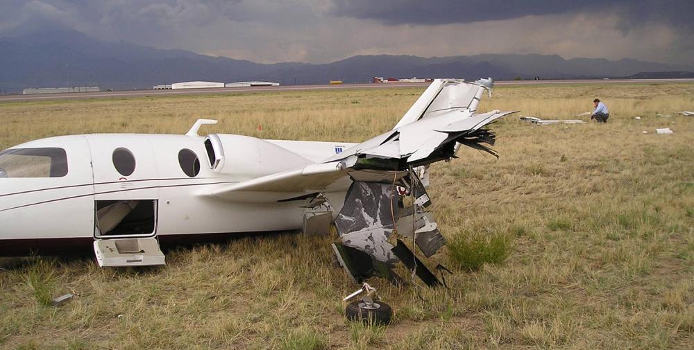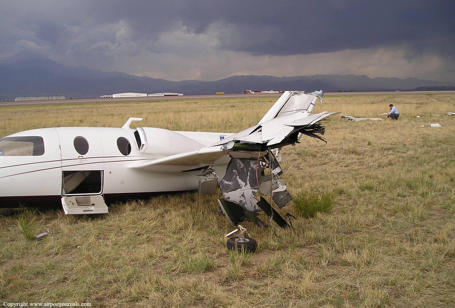 According to the pilot, passenger, and several witnesses, during takeoff the light jet became airborne momentarily, and then banked aggressively to the left. It impacted the runway in a left wing low attitude and cartwheeled down the runway. An examination of the airplane's systems revealed no anomalies. Approximately 1.5 minutes before the airplane was cleared for takeoff, a De Havilland Dash 8 (DH-8) airplane departed. A wake turbulence study conducted by an NTSB aircraft performance engineer concluded that even slight movement in the atmosphere would have caused the circulation of the vortices near the accident site to decay to zero within two minutes, that is, before the time accident jet would have encountered the wake from the DH-8. The study states, in part: "Given the time of day of the accident, consistent reports of easterly surface wind speeds on the order of 6 to 7 knots, higher wind speeds aloft, and the mountainous terrain near Colorado Springs, it is unlikely that the atmosphere was quiescent enough to allow the wake vortices near the Sport-Jet to retain any significant circulation after two minutes. Furthermore, easterly surface winds would have blown the wake vortices well to the west of the runway by the time of the accident. Consequently, while in smooth air the wake vortices from the DH-8 that preceded Sport-Jet off of the runway may have retained enough circulation after two minutes to produce rolling moments on Sport-Jet on the order of the rolling moment available from the Sport-Jet's ailerons, it is most likely that the wake vortices were neither strong enough nor close enough to the Sport-Jet to cause the violent roll to the left reported by the pilot and witnesses to the accident."