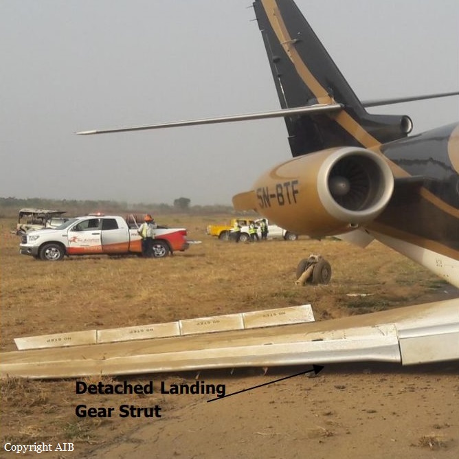 On 25th January 2018 at 14:28 h, a Gulfstream 200 (G200) aircraft with nationality and registration marks 5N-BTF operated by Nestoil Plc, departed Murtala Mohammed International Airport, Lagos (DNMM) as a charter flight to Nnamdi Azikiwe International Airport, Abuja (DNAA) on an Instrument Flight Rules (IFR) flight plan. Onboard were four passengers and three flight crew members. The Pilot in command (PIC) was the Pilot Monitoring (PM) and the Co-pilot was the Pilot Flying (PF). The departure, cruise and approach to Nnamdi Azikiwe International Airport were normal. At 14:45 h, 5N-BTF contacted Abuja radar and was subsequently cleared for Radar vectors ILS approach Runway 22. Abuja Airport Automatic Terminal Information Service (ATIS) Papa for time 14:20 h was monitored as follows; “Main landing runway 22, wind 110/07 kt, Visibility 3,500 m in Haze, No Significant Clouds, Temperature/Dew point 33/- 01°C, QNH 1010 hPa, Trend No Significant Change, End of Information Papa”. At 15:17 h, 5N-BTF reported 4 NM on Instrument approach (ILS) and was requested to report 2 NM because there was a preceding aircraft (Gulfstream 5) on landing roll. Thereafter, 5N-BTF was cleared to land runway 22 with reported wind of 070°/07 kt. At 15:18 h, the aircraft touched down slightly left of the runway centre line. According to the PF, in the process of controlling the aircraft to the centre line, the aircraft skidded left and right and eventually went partly off the runway to the right where it came to a stop. In his report, the PM stated that on touchdown, he noticed the aircraft oscillating left and right as brakes were applied. The oscillation continued to increase and [the aircraft] eventually went off the runway to the right where the aircraft came to a stop, partially on the runway. During the post-crash inspection, the investigation determined that the skid marks on the runway indicated that the aircraft steered in an S-pattern continuously with increasing amplitude, down the runway. On the last right turn, the aircraft exited the right shoulderof the runway, the right main wheel went into the grass and on the final left turn, the right main landing gear strut detached from its main attachment point after which the aircraft finally came to a complete stop on a magnetic heading of 160°. The ATC immediately notified the Aircraft Rescue and Fire Fighting Services (ARFFS), Approach Radar Control, and other relevant agencies about the occurrence. All persons on board disembarked with no injuries. Instrument Meteorological Conditions (IMC) prevailed at the time of the occurrence. The serious incident occcurred in daylight.