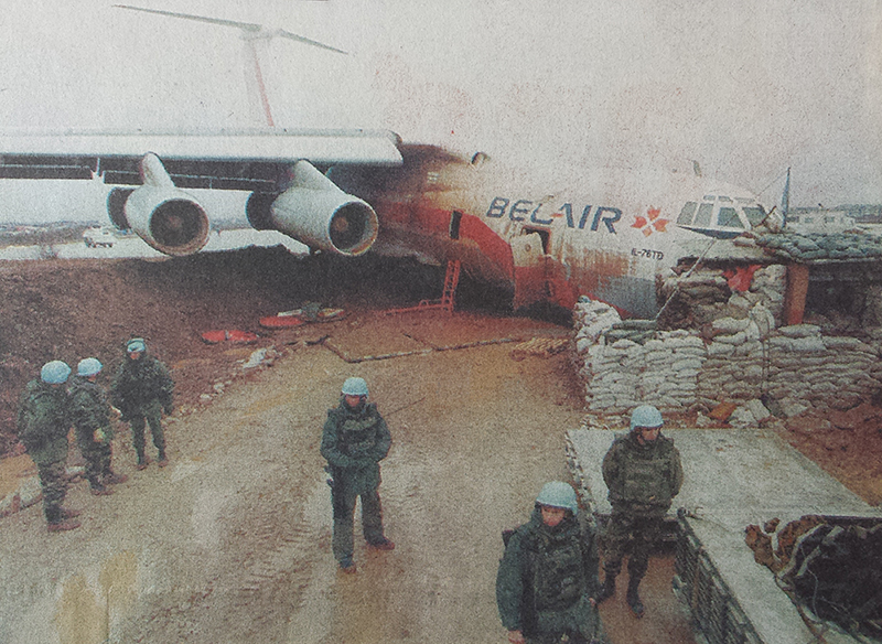 The approach to Sarajevo was completed in marginal weather conditions with strong winds and rain falls. After touchdown, the aircraft was unable to stop within the remaining distance, overran and eventually collided with military installations. All six crew members escaped uninjured while the aircraft was damaged beyond repair.