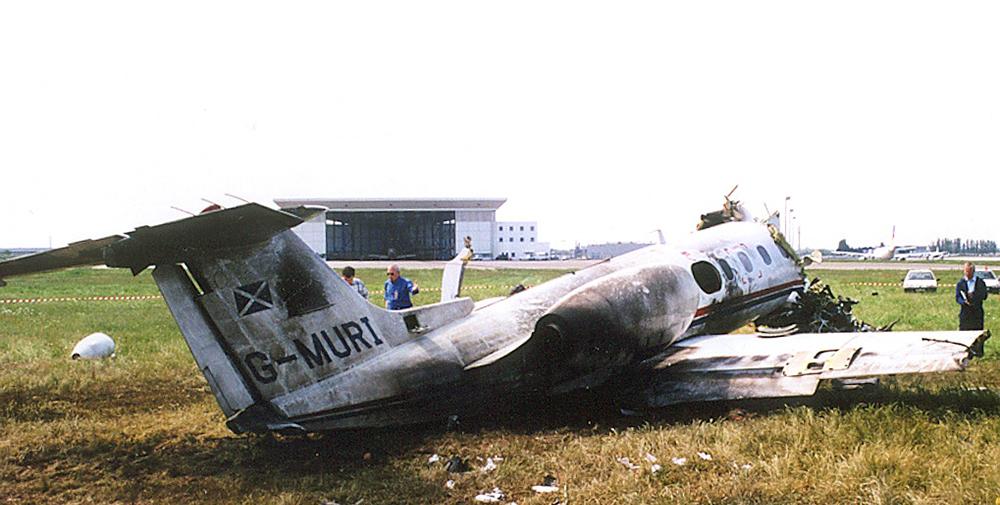 The aircraft departed Farnborough Airport at 11h22 on a charter flight to Nice with two pilots and three passengers on board, among them the F1 driver David Coulthard. At 12h22, cruising at FL390, the left engine of the aircraft suffered a failure. The crew shut down and began to descend. They declared an emergency and asked to fly to the nearest aerodrome with a runway longer than one thousand six hundred metres. Lyon-Satolas Airport, located about 62 NM away left abeam of the aircraft, was proposed. The descent with one engine shut down towards Lyon-Satolas was undertaken under radar guidance, at a high speed and with a high rate of descent. At 12h35, the pilot stabilised the aircraft at 3,000 feet, intercepted the runway 36L ILS and was cleared to land. The final was started at 233 knots according to radar data and the slow down progressive. At 12h36 min 45 s, the flaps were extended to 8°. According to the radar data, the aircraft was then at 2,400 feet, 4,4 NM from the runway threshold and at a speed of 184 knots. At 12h36 min 58 s, the landing gear was extended. At 12h37 in 03 s, the flaps were set to 20°. According to the radar data, the aircraft was then at 2,100 feet, 3,5 NM from the runway threshold at a speed of 180 knots. No malfunctions or additional problems were announced to the ATC by the crew during the final approach. At 12h38 min 08 s, the copilot told the captain that the aircraft was a little low. According to the radar data, the aircraft was then at 1,100 feet, 0,9 NM from the runway threshold at a speed of 155 knots. At 12h38 min 17 s, he repeated his warning and announced a speed 10 knots above the approach reference speed. At 12h38 min 22 s, the copilot again stated that the aircraft was a little low on the approach path and immediately afterwards asked the captain to increase the thrust. According to the radar data, the aircraft was then at 900 feet, 0,1 NM from the runway threshold at a speed of 150 knots. At 12h38 min 24 s, the captain indicated that he was losing control of the aircraft. The aircraft, over the runway threshold, banked sharply to the left, touched the ground with its wing, crashed and caught fire. Both pilots were killed while all three passengers evacuated with minor injuries.