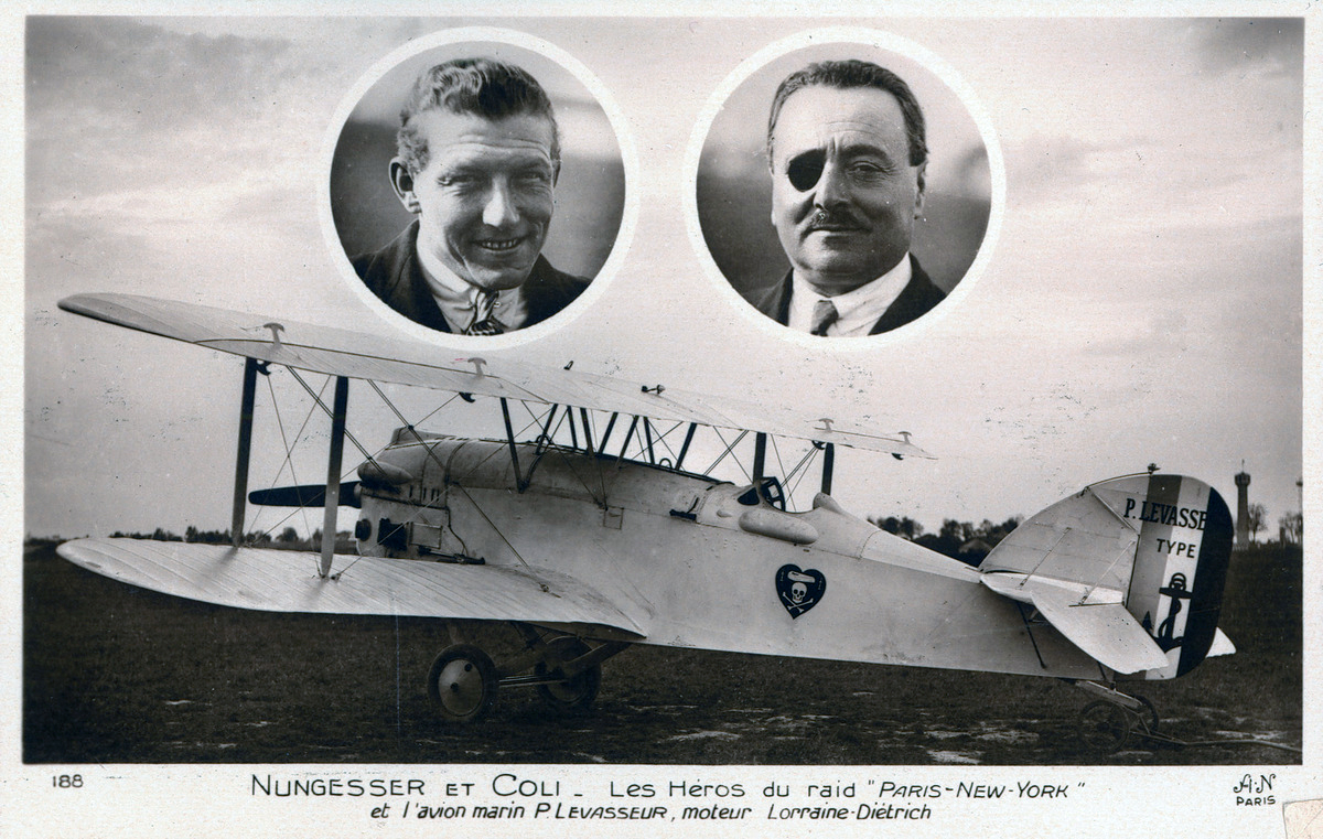 Named L'Oiseau Blanc, the aircraft took off at 0517LT on 8 May 1927 from Paris-Le Bourget Airport, heading for New York with two French aviators on board: Charles Nungesser and François Coli. They tried to make the first transatlantic non stop flight from Paris to New York counting for the Orteig Prize. The biplane weighed 5,000 kg (11,000 lb) on takeoff, extremely heavy for a single-engined aircraft. The intended flight path was a great circle route, which would have taken them across the English Channel, over the southwestern part of England and Ireland, across the Atlantic to Newfoundland, then south over Nova Scotia, to Boston, and finally to a water landing in New York. L'Oiseau Blanc had been carrying a sizable load of fuel, 4,000 liters (1,056.7 US gal), which would have given them approximately 42 hours of flight time. Crowds of people gathered in New York to witness the historic arrival, with tens of thousands of people crowding Battery Park in Manhattan to have a good view of the Statue of Liberty, where the aircraft was scheduled to touch down. After their estimated time of arrival had passed, with no word as to the aircraft's fate, it was realized that the aircraft had been lost. Rumors circulated that L'Oiseau Blanc had been sighted along its route, in Newfoundland, or over Long Island, and despite the launch of an international search, further search efforts were eventually abandoned on 09JUN1927. As of 2008, the landing gear is the only confirmed part of the L'Oiseau Blanc remaining, and is on display at the Musée de l'Air et de l'Espace (French Air and Space Museum), in Le Bourget Airport in Paris, the location from which L'Oiseau Blanc took off. This landing gear was dropped by the crew shortly after takeoff from Le Bourget.