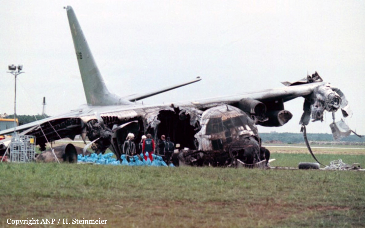 The aircraft was chartered by the Dutch Air Force (Koninklijke Luchtmacht) to fly the Dutch Air Force's brass band from Italy back to the Netherlands. The transport plane arrived at Verona-Villafranca at 13:33. Forty passengers boarded the plane and at 15:04 the Hercules took off from Villafranca for a short flight to Rimini, where it landed at 15:31. Three passengers deplaned at Rimini and the Hercules was back in the air at 15:55 heading for Eindhoven. The Hercules descended into Eindhoven and contacted Eindhoven Tower at 18:00. Eindhoven Tower cleared the flight for the approach: "Okay, you may continue descent for 1000, as number one in traffic, for a direct final course runway 04, QNH 1027." After reported the runway in sight, the Hercules was cleared to land: "610 is cleared to land runway 04, the wind from 360° 10 knots." Possibly as a result of the presence of a large number of birds near the runway, the copilot initiated a go around. Birds were ingested by both left hand engines (n°1 and 2), causing both engines to lose power. For reasons unknown the crew shut down engine n°3 and feathered the propeller. The plane then turned left and crashed off the left side of the runway. Within seconds a fire erupted which was fed by the oxygen from the airplane's oxygen system. Some emergency exits in the main cabin were unreachable because of the fire while other exits could not be opened because of twisting of the fuselage. The fact that there were a large number of passengers on board the plane was not immediately clear tot the fire fighters. It took some 23 minutes before passengers were noted in the main cabin.