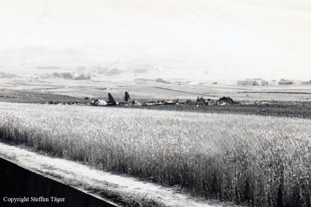 This was acknowledged by the flight. The pilot, who saw the beginning of runway 30 clearly but not the rest of it, decided to make a very low run after which he re-applied power for a go-around at 2106 hours. He circled the aerodrome, apparently intending to land, and at 2115 hours reported on final. At 2117 hours he reported to the tower: "401 pulling up to go around", and this was the last communication received from the aircraft. It was subsequently found that, when starting its go-around, the aircraft struck a scraper and tractor located 50 m from the runway edge, with one leg of the undercarriage and the lower aft part of the fuselage. It left various debris scattered about and finally crashed on the western edge of the diversion canal of the Rodeo gorge. From there, it slid about 100 m across private farmland and finally burst into flames. The accident occurred at 2117 hours.