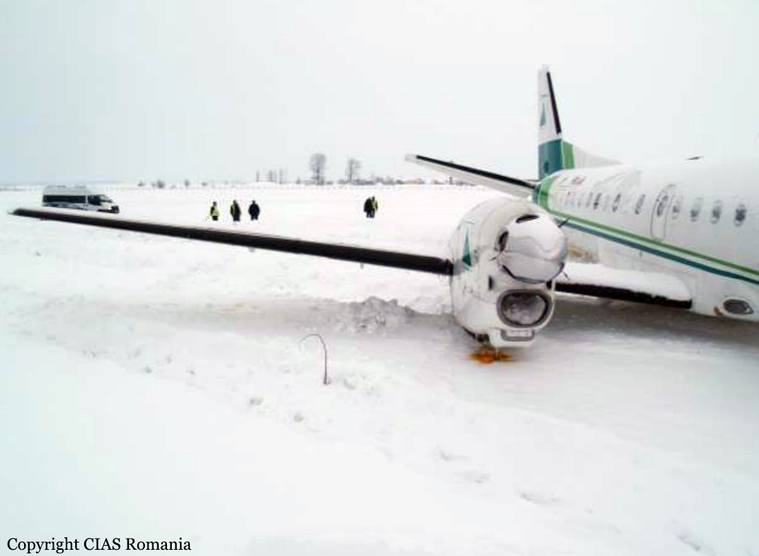 The crew started the takeoff procedure from runway 09 at Craiova Airport in a visibility of 500 metres due to freezing fog. During the course, the aircraft deviated to the right, causing the right engine to struck a snow berm (one meter high). The right propeller was torn off then aircraft rolled for few metres before coming to rest in snow. All 55 occupants evacuated safely while the aircraft was damaged beyond repair.