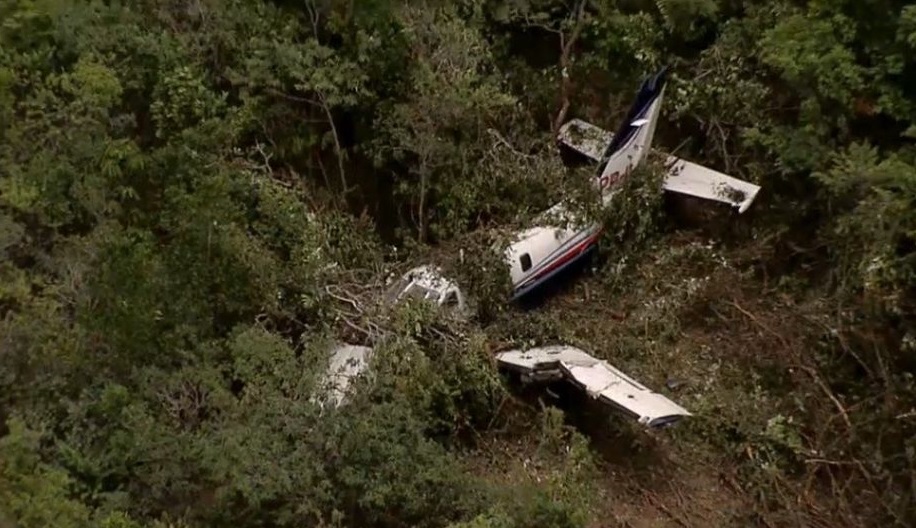 The single engine airplane departed Fazenda Santa Maria Airfield located 116 km west of Formosa do Rio Preto, Bahia, on a flight to Brasília, carrying four passengers and one pilot. On final approach to Brasília-Nelson Piquet Airport runway 28, the pilot encountered marginal weather conditions with crosswind. The airplane impacted the ground in the grassy area, approximately 3 metres beyond the lateral edge of runway 28 with no evidence of prior ground contact or impact. The terrain alongside the runway sloped downward and was covered with native vegetation (cerrado biome). The pilot attempted a go around procedure but the airplane veered off runway to the left at a speed of 70 knots and collided with trees, coming to rest 120 metres further. The airplane was destroyed and all five occupants escaped unhurt.