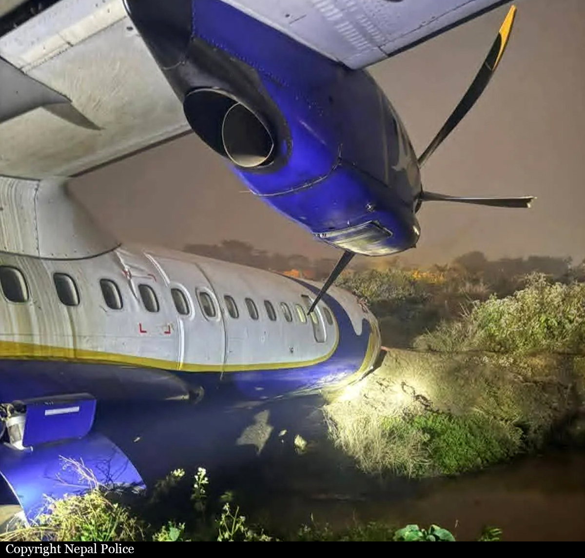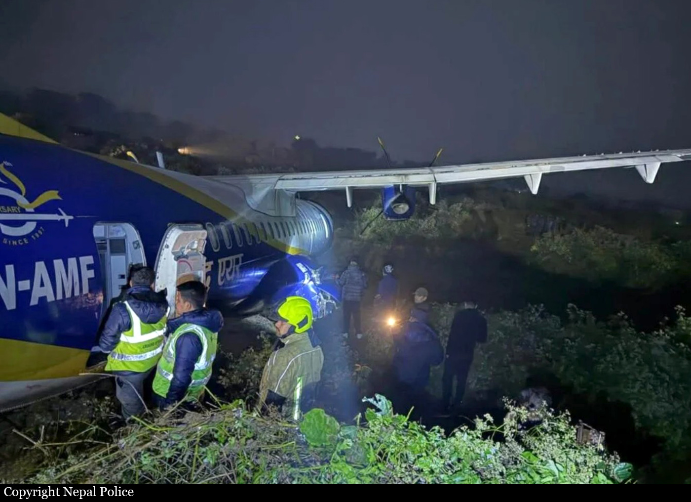 After landing on runway 10 at Bhadrapur Airport, the airplane was unable to stop within the remaining distance (runway 10 is 1,500 metres long). It overran and came to rest in a creek located 170 metres past the runway end, coming to rest against an embankment. All 55 occupants were rescued, among them seven were injured including the copilot. The cockpit was severely damaged and the fuselage was bent.