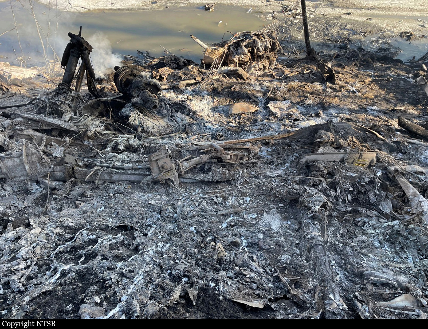 The purpose of the flight was to transport 3,400 gallons of unleaded fuel and two 100-gallon propane tanks from Fairbanks International Airport (FAI), to Kobuk Airport (OBU), Kobuk, Alaska. The airplane departed about 0955. An eyewitness reported seeing the airplane flying to the west and stated that the far left engine was not running. They also noticed a small, white plume of smoke coming from that engine. The airplane started to turn to the south, and at that point he noticed that the engine was on fire. About three minutes after departure, the pilot reported to air traffic control that there was a fire onboard and began a left turn back to the airport. Video surveillance showed white smoke begin to develop behind the No. 1 engine, followed by flames. Seconds later, a bright white explosion could be seen just behind the No. 1 engine. The airplane then entered an uncontrolled, descending left turn into terrain. The No. 1 engine separated from the wing about 100 ft above the ground and landed on a frozen river. About two minutes later, the video showed a large explosion. The University of Alaska Fairbanks (UAF) detected multiple low frequency sound (infrasound) signals associated with the accident. Based on the data collected by UAF, the first explosion was at 1001, the airplane impacted terrain at 1003, and the second explosion was at 1006. The airplane was totally destroyed by impact forces and a post crash fire and both crew members were fatally injured.