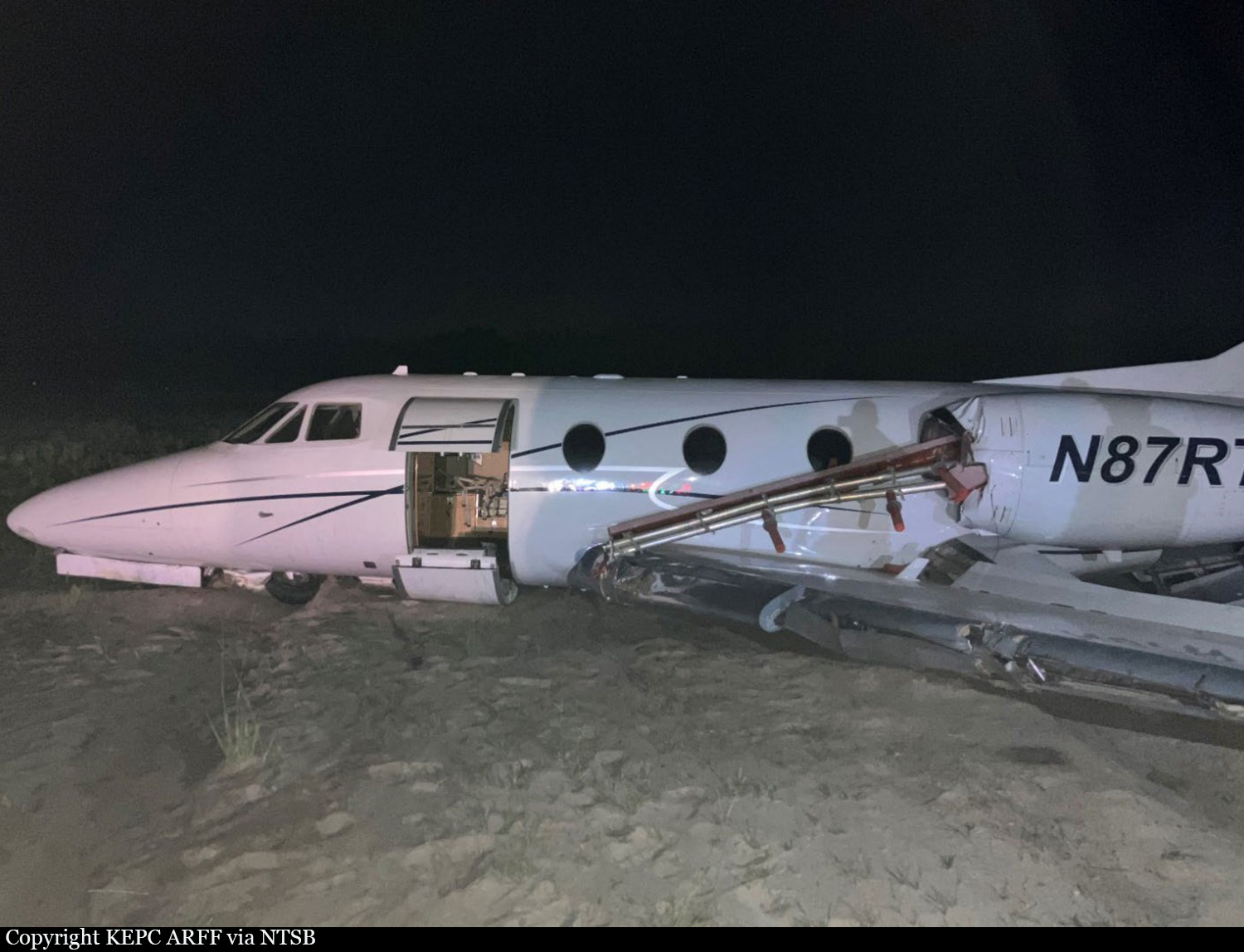 On February 9, 2024, about 1517 eastern standard time, a Bombardier Inc CL-600-2B16, N823KD, was destroyed when it was involved in an accident near Naples, Florida. The two airline transport pilots were fatally injured. The cabin attendant and the two passengers sustained minor injuries, and one person on the ground suffered minor injury. The airplane was operated by Ace Aviation Services (doing business as Hop-A-Jet) as a Title 14 Code of Federal Regulations Part 135 on-demand passenger flight. The airplane was returning to Naples Municipal Airport (APF), Naples, Florida, from Ohio State University Airport (OSU), Columbus, Ohio, where it had flown earlier in the day. The airplane was serviced with 350 gallons of fuel before departure from OSU. Preliminary Automatic Dependent Surveillance – Broadcast (ADS-B) flight track and air traffic control (ATC) data revealed that the flight crew contacted the ATC tower at APF while on a right downwind leg of the approach to the airport and maneuvering for a 5-mile final approach to runway 23. At 1508, the tower controller cleared the flight to land. The airplane was about 6.5 miles north of APF, about 2,000 ft geometric altitude (GEO) and 166 knots groundspeed, as it turned for the base leg of the traffic pattern. A preliminary review of the data recovered from the airplane’s flight data recorder revealed that the first of three Master Warnings was recorded at 1509:33 (L ENGINE OIL PRESSURE), the second immediately following at 1509:34 (R ENGINE OIL PRESSURE), and at 1509:40 (ENGINE). The system alerted pilots with illumination of a “Master Warning” light on the glareshield, a corresponding red message on the crew alerting system page and a triple chime voice advisory (“Engine oil”). Twenty seconds later, at 1510:05, about 1,000 ft msl and 122 kts, on a shallow intercept angle for the final approach course, the crew announced, “…lost both engines… emergency… making an emergency landing” (see figure 1). The tower controller acknowledged the call and cleared the airplane to land. At 1510:12, about 900 ft and 115 knots, the crew replied, “We are cleared to land but we are not going to make the runway… ah… we have lost both engines.” There were no further transmissions from the flight crew and the ADS-B track data ended at 1510:47, directly over Interstate 75 in Naples, Florida. Dashcam video submitted to the National Transportation Safety Board captured the final seconds of the flight. The airplane descended into the camera’s view in a shallow left turn and then leveled its wings before it touched down aligned with traffic travelling the southbound lanes of Interstate 75. The left main landing gear touched down first in the center of the three lanes, and then the right main landing gear touched down in the right lane. The airplane continued through the break-down lane and into the grass shoulder area before impacting a concrete sound barrier. The airplane was obscured by dust, fire, smoke, and debris until the video ended. This information is preliminary and subject to change. After the airplane came to rest, the cabin attendant stated that she identified that the cabin and emergency exits were blocked by fire and coordinated the successful egress of her passengers and herself through the baggage compartment door in the tail section of the airplane.