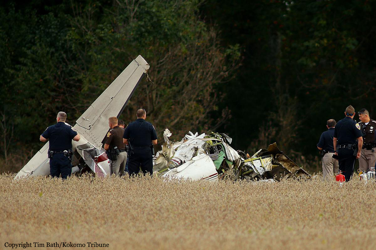 On November 30, 2018, about 1028 central standard time, a Cessna 525A (Citation) airplane, N525EG, was destroyed when it was involved in an accident near Memphis, Indiana. The pilot and two passengers were fatally injured. The airplane was operated as a Title 14 Code of Federal Regulations Part 91 business flight. The cross-country flight originated from Clark Regional Airport (JVY), Jeffersonville, Indiana, and was en route to Chicago Midway International Airport (MDW), Chicago, Illinois. The airplane was equipped with automatic dependent surveillance–broadcast (ADS-B), which recorded latitude and longitude from GPS, pressure and geometric altitude, and selected altitude and heading. The airplane was also equipped with a cockpit voice recorder (CVR), which recorded the accident flight and annunciations from the enhanced ground proximity warning system (EGPWS). It was not equipped with a flight data recorder (FDR) nor was it required to be. Review of the CVR transcript showed that the pilot operated as a single pilot but verbalized his actions as he configured the airplane before departure. He referenced items from the Before Taxi checklist and included in his crew briefing that in the event of a problem after takeoff decision speed, he would handle it as an in-flight emergency and “fly the airplane, address the problem, get the autopilot on, talk on the radios, divert over to Stanford.” The air traffic controller provided initial clearance for the pilot to fly direct to the STREP intersection and to climb and maintain 3,000 ft mean sea level. Before the departure from JVY, the pilot announced on the common traffic advisory frequency that he was departing runway 36 and verbalized in the cockpit “this is three six” before he advanced the throttles. The flight departed JVY about 1024:36 into instrument meteorological conditions. The CVR recorded the pilot state that he set power to maximum cruise thrust, switched the engine sync on, and turned on the yaw dampers. The pilot also verbalized his interaction with the autopilot, including navigation mode, direct STREP, and vertical speed climb up to 3,000 ft. According to the National Transportation Safety Board’s (NTSB) airplane performance study, the airplane climbed to about 1,400 ft msl before it turned left onto a course of 330° and continued to climb. The CVR recorded the pilot state he was turning on the autopilot at 1025:22. At 1025:39, the pilot was cleared up to 10,000 ft and asked to “ident,” and the airplane was subsequently identified on radar. The pilot verbalized setting the autopilot for 10,000 ft and read items on the After Takeoff/Climb checklist. The performance study indicated that the airplane passed 3,000 ft about 1026, with an airspeed between 230 and 240 kts, and continued to climb steadily. At 1026:29, while the pilot was conducting the checklist, the controller instructed him to contact the Indianapolis Air Route Traffic Control Center; the pilot acknowledged. At 1026:38, the pilot resumed the checklist and stated, “uhhh lets seeee. Pressurization pressurizing anti ice de-ice systems are not required at this time.” The performance study indicated that, at 1026:45, the airplane began to bank to the left at a rate of about 5° per second and that after the onset of the roll, the airplane maintained airspeed while it continued to climb for 12 seconds, consistent with engine power not being reduced in response to the roll onset. At 1026:48, the CVR recorded the airplane’s autopilot disconnect annunciation, “autopilot.” The performance study indicated that about this time, the airplane was in about a 30° left bank. About 1 second later, the pilot stated, “whooooaaaaah.” Over the next 8 seconds, the airplane’s EGPWS annunciated six “bank angle” alerts. At 1026:57, the airplane reached its maximum altitude of about 6,100 ft msl and then began to descend rapidly, in excess of 11,000 ft per minute. At 1026:58, the bank angle was about 70° left wing down, and by 1027:05, the airplane was near 90° left wing down. At 1027:04, the CVR recorded a sound similar to an overspeed warning alert, which continued to the end of the flight. The performance study indicated that about the time of the overspeed warning, the airplane passed about 250 kts calibrated airspeed at an altitude of about 5,600 ft. After the overspeed warning, the pilot shouted three expletives, and the bank angle alert sounded two more times. According to the performance study, at 1027:18, the final ADS-B data point, the airplane was about 1,000 ft msl, with the airspeed about 380 kts and in a 53° left bank. At 1027:11, the CVR recorded the pilot shouting a radio transmission, “mayday mayday mayday citation five two five echo golf is in an emergency descent unable to gain control of the aircraft.” At 1027:16, the CVR recorded the EGPWS annunciating “terrain terrain.” The sound of impact was recorded about 1027:20. The total time from the beginning of the left roll until ground impact was about 35 seconds. The accident site was located about 8.5 miles northwest of JVY.