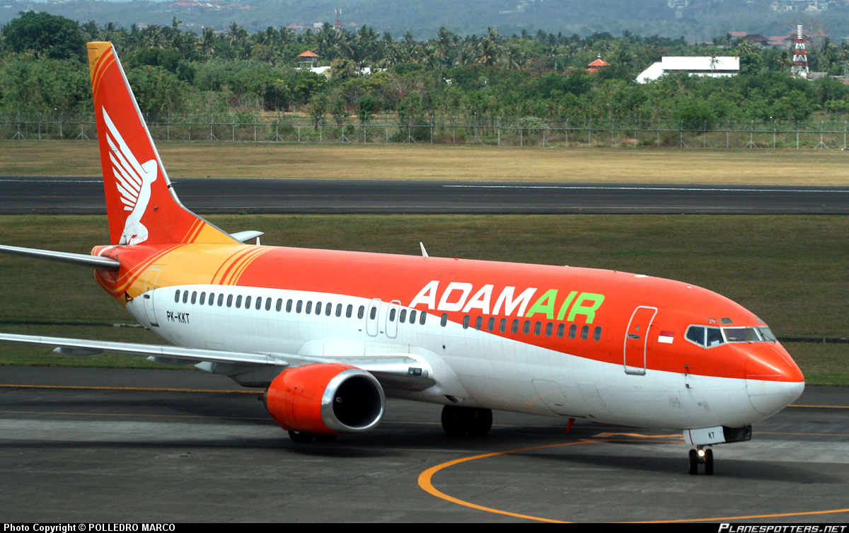 On 10 March 2008, a Boeing Company 737-400 aircraft, registered PK-KKT, was being operated by Adam SkyConnection Airlines (Adam Air) as scheduled passenger flight with flight number DHI292. The flight departed Soekarno – Hatta Airport, Jakarta at 01:30 UTC with destination Hang Nadim Airport, Batam and the estimated time of arrival was 03:05 UTC. On board in this flight were 177 people consisted of two pilots, four flight attendants, and 171 passengers. The Pilot in Command (PIC) acted as pilot flying (PF) and the Second in Command (SIC) acted as pilot monitoring (PM). The flight until commencing descend was uneventful. Prior to descend, the flight crew received weather information indicating that the weather was fine. At 0302 UTC the flight crew contacted Hang Nadim tower controller and informed them that the visibility was 1,000 meters and they were sequence number three for landing runway 04. The flight crew of the aircraft on sequence number two informed to Hang Nadim tower controller that the runway was insight at an altitude of about 500 feet. The Hang Nadim tower controller forwarded the information to the flight crew of DHI 292, and followed this by issuing landing clearance, and additional information that the wind velocity was 360 degrees at 8 knots and heavy rain. The DHI 292 flight crew acknowledged the information. The landing configuration used flaps 40 degrees with landing speed of 136 knots. The flight crew were able to see the runway prior to the Decision Altitude (DA), however the PIC was convinced that continuing the approach to landing was unsafe and elected to go around. The Hang Nadim tower controller instructed the flight crew to climb to 3000 feet, maintain runway heading, and contact Singapore Approach. At 0319 UTC, DHI 292 was established on the localizer runway 04, and the Hang Nadim tower controller informed them that the visibility improved to 2,000 meters. While on final approach, the flight crew DHI 292 reported that the runway was in sight and the Hang Nadim tower controller issued a landing clearance. On touchdown, the crew felt that the main wheels barely touch the runway first. During the landing roll, as the ground speed decreased below 30 knots, the aircraft yawed to the right. The flight crew attempted to steer the aircraft back to centerline by applying full left rudder. The aircraft continued yaw to the right and came to stop on the runway shoulder at approximately 40 meters from the right side of the runway edge, and 2,760 meters from the runway 04 threshold. No one was injured in this accident. The aircraft was seriously damaged with the right main landing gear assembly detached and collapsing backward and damaging the right wing and flaps. The right engine was displaced from its attachment point.
